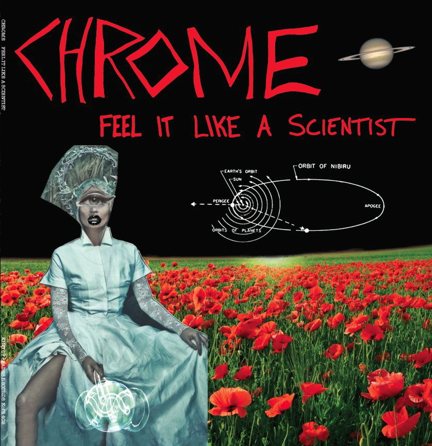 „Feel it like a Scientist“ beinhaltet satte 16 neue Songs und beginnt mit einem typischen kreischenden Creed-Gitarrenintro zu “Nephilims (Help me)”, bei dem der Space-Hippie genauso seine Kreise auf der Tanzfläche drehen, wie auch der Metalhead seine Mähne kreisen lassen kann. Track Nummer zwei, „Prophecy“, beginnt mit Soundschnipseln, die an ein altes Transistorradio erinnern, bevor es in der gleichen galoppierenden Geschwindigkeit wie beim Eröffnungssong weitergeht. Das darauf folgende „Lipstick“ schaltet einen kurzen Gang zurück in eine schleppende Kakophonie aus Soundschnipseln, Feedbacks und Jahrmarktgeklimper, bevor es mit „Lady Feline“ einen wahren Gothrockkracher in Sisters of Mercy-Manier zu hören gibt. Spacewolkig wird es bei „Something in the Cloud“, und mit dem folgendem kurz mit „Six“ betitelten Track geht es wieder zurück in den düsteren Gothic-Abyss. „Unbreakable Fluoride Lithium Plastic“ vereint das Flair des legendären 82er Werkes „3rd from the Sun“ zusammen mit einer Stimme like Ozzy Osbourne. „Captain Boson“ trampelt in bewährter Chrome-Manier sämtliche Hindernisse nieder, die durch die durchdringende Creed Gitarre von links und rechts zersägt wurden. Das folgende „Big Brats“ schlägt in die gleiche Kerbe, bevor mit „Brad the Chickenboy“ nochmals ein Gang zugelegt wird. Der spacige Sound vom Instrumental „Slave Planet Institution“, lediglich befeuert von Sprachfetzensamples, scheint direkt aus dem Weltraum zu kommen, bevor das rollende Bassriff von Jay Tausig den mit siebeneinhalb Minuten längsten Track, „Cyberchondria“, wieder in bewährte Bahnen lenkt. „Himalayanelimination“ fegt in bekannter Spacerock-Manier a la Hawkwind durch die Gehörgänge, bevor es mit dem langsamen „The Mind“ wieder in die gruftigen Abgründe taucht, aus dem die verhallte Stimme von Creed wie das Gebet eines Hohepriesters emporsteigt. Die Mid-Temponummer „Systems within Systems“ folgt bewährten Pfaden und beim abschließendem „Nymph Droid“ entschwebt der chromische Klangkörper in himmlische Sphären und man wartet unweigerlich auf gregorianische Gesänge, die zu dem an tibetische Klangschalen erinnernden Klanggebilde perfekt passen würden.