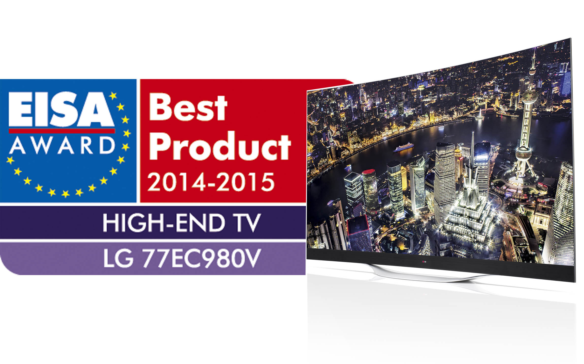 In der Unterkategorie High End-Fernseher wurde der LG 77EC980V, einer der neuen 4K OLED TVs von LG mit 77-Zoll (196 cm)-Display, vom EISA-Verband als bestes Produkt 2014-2015 prämiert. Schon auf der Consumer Electronics Show (CES) 2013 gewannen LGs 4K OLED TVs den „Best of Innovations“-Award. Der neue 4K OLED ist mit LGs bedienungsfreundlicher webOS-Plattform ausgestattet und setzt damit LGs Ziel, seinen Kunden ein problemloses Anschließen, einfaches Umschalten und intuitives Navigieren zu bieten, perfekt um. Auch das webOS-System wurde von der EISA für seine außergewöhnlich intuitive Benutzeroberfläche ausgezeichnet. Mit seiner 4K (3840 x 2160)-Auflösung verfügt der LG 77EC980V über die derzeit beste Display-Technologie im Markt: ein gebogenes OLED-Panel mit Ultra-HD-Auflösung. Das von LG Display entwickelte zukunftsweisende Panel verfügt über LGs proprietäre Vier-Farb-Pixel-Technologie WRGB, die mittels 33 Millionen Sub-Pixel naturgetreue Farben und ein nahezu unendliches Kontrastverhältnis mit helleren, natürlichen Farbtönen und einem tiefen, satten Schwarz ermöglicht. Zusätzlich hat LG das Gerät auch mit seiner True 4K Engine Pro-Technologie ausgestattet, mit der sich niedriger aufgelöste Inhalte auf beinahe Ultra HD-Bildqualität hochrechnen lassen. Das Bildschirmgeschehen wird so durch unglaublich scharfe Bilder mit hohem Detailgrad zu einem intensiven, sehr realitätsnahen Seherlebnis, das die Überlegenheit der OLED-Display-Technologie gegenüber herkömmlichen Bildschirmen unterstreicht. Der ergonomisch geschwungene Bildschirm des 77EC980V 4K OLED TVs vervollkommnet das cineastische Seherlebnis.