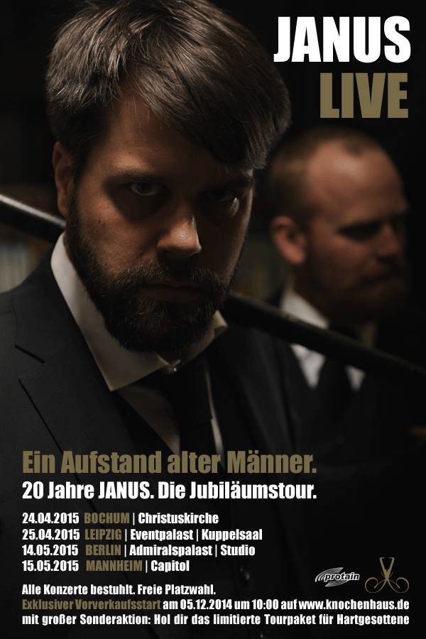 Man weiß ja nie so genau, ob und wann JANUS noch mal auf Tour gehen werden. Jedes Mal soll es das letzte Mal sein, aber diese Schwüre halten dann doch nicht ewig. Ähnlich verhält es sich mit Alben der Formation. In diesem Jahr mussten Dirk RIG Rigert und Tobias Hahn aber auf Tour gehen. Es ging quasi nicht anders. Nicht, dass die Fans mal wieder vorsichtig angeklopft und nachgefragt hätten, das geschieht öfter, meist erfolglos. In diesem Jahr steht das 20-jährige Jubiläum an und da muss man einfach noch mal auf die Bühne und sich präsentieren. Allerdings muss man dafür werben (haben JANUS sowas überhaupt nötig?), packen und reisen – und am Ende sogar auftreten! Das wird geradezu ein Aufstand alter Männer! Vier Konzerte stehen an und die Fans freuen sich. Die Karten waren so schnell ausverkauft, dass man nicht mal rechtzeitig darauf hinweisen konnte, dass es überhaupt Karten geben wird. Nun sind nur noch Restkarten übrig und natürlich auch welche, die aus terminlichen Gründen wieder hergegeben werden. Wer dabei sein wird, kann sich auf ein überraschendes Konzert freuen, denn auch wenn nichts sicher ist, das ist es: Bei JANUS ist alles möglich!