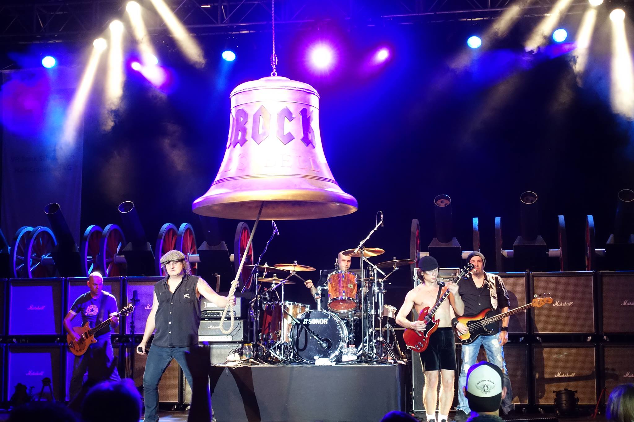 Der letzte große Hingucker schwebt über der Szenerie. Die Glocke, die für den Song Hells Bells herabgelassen und von Foster in Bewegung gebracht wird. Damit das nicht schief geht, steht drauf, bei welchem Lied zu läuten ist und darüber der Bandname. Der Strick baumelt die sonstige Zeit deutlich über Kopfhöhe, kann also richtig fotografiert wie die drohende Schlinge eines Henkers erscheinen.
