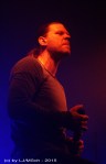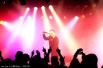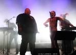 Schon am ersten Tag wurden wir von Insidern aufgeklärt, dass Agonoize satte 45 Liter Kunstblut und 20 Liter künstliches Sperma dabei hätten. Na danke war die allgemeine Meinung der Fotografenmeute und die besten Tricks zur Plastination des wertvollen Kamera-Equipments wurden ausgetauscht. Die Bühne wurde seitlich und vorne mit Plastikplanen verkleidet, ebenso das Mischpult im FOH. Die beiden Securitys hüllten sich in dichte Anoraks oder selbstgebastelte Plastikverhüllungen und nahmen ihre Plätze ein als der endgültige letzte Headliner seinen Auftritt hatte. Keyboarder Ollie trat im dichten Nebel nach vorne an den Bühnenrand und zack – landete er im Fotograben. Einen nüchternen Eindruck machte er dabei bestimmt nicht. Leider konnten wir Olli dabei nicht ablichten, weil wir mit Aufhelfen beschäftigt waren. Schade, denn Chris L. fragte im Nachhinein, ob irgendwer davon ein Bild geschossen hätte. Nachdem Olli sein Soundgewitter gestartet hatte, kam er auf die Bühne. Mastermind Chris L. in schwarze Klamotten und Sicherheitsweste gewandet, legte auch gleich los wie Harry auf Speed. Von Anfang an ging die Publikumsmeute mit wie nochwas und erschütterte die Theaterfabrik in ihren Grundfesten. Insidertechnisch wurden wir vorgewarnt, dass beim dritten Song die Agonoize-typische Blutorgie beginnen sollte. Chris fuchtelte mit einem riesigen Fleischermesser auf der Bühne rum und haute sich dabei den Knauf dessen so an den Kopf, dass ihm das (Kunst-) Blut in Strömen herunter lief. Gleich drauf schnitt er sich die Pulsadern damit durch, so dass das Blut nur noch in Fontänen aus ihm herausspritzte. Gute zehn Meter schoss der Strahl aus seinem Arm und badete die Menge im Kunstblut. Den Leuten gefiel’s und Chris spielte seine ganze Erfahrung als Rampensau aus, wenn er nicht gerade damit beschäftigt war, sich über Olli im Hintergrund zu wundern, der dabei war, beinahe seine Keyboardburg zu zerlegen und vom Podest zu schmeißen. Chris badete in der Menge, Hit an Hit folgte und die 70 Minuten Spielzeit waren viel zu schnell rum. Agonoize sind ein Garant für eine saugute Show und das zeigten sie heute wieder einmal in bester Manier. Ein wahrlich bestmöglicher Abschluss für das DMF 2015.