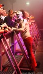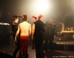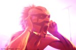 Die Securitys, Fotografen und die Technik bereitet sich auf den Hauptact vor. Man weiß sofort, wer bald auf der Bühne stehen wird, denn nicht umsonst wird alles mit Plastikfolie abgedeckt, was auch nur ansatzweise empfindlich ist. Gut, die Fans stellen sich absichtlich in die erste Reihe und hoffen darauf, eingesaut zu werden. Agonoize haben ca. 45 l Kunstblut und über 20 l Kunstsperma im Gepäck und werden nicht sparsam damit umgehen! Als es dunkel wird, brüllt die Theaterfabrik los. Die Stimmung ist vom ersten Song an super, auch wenn die Halle voller sein könnte. Agonoize hämmern ihren Aggrotech ins begeisterte Publikum und warten bis zum dritten Song, bis endlich das Blut spritzt und Fronter Chris L. sich scheinbar Pulsadern und einiges mehr aufschneidet. Das Kunstblut spritzt recht weit, aber das stört niemanden sonderlich, schließlich weiß man im Voraus, worauf man sich einlässt. Die Fans geben sich textsicher, Olli hingegen gibt eine kleine unfreiwillige Showeinlage zum besten und macht einen Kniefall von der Bühne runter vor die Fotografen – die allesamt zu überrascht sind, als dass es Beweisbilder geben könnte. Soweit wir wissen, ist Olli glücklicherweise nichts passiert und er fetzt die gesamte Show durch. Sehr stürmisch rüttelt er an den Synthesizern und bringt auch sie recht nahe an den Rand des Absturzes. Auffällig ist, dass viele Besucher das Konzert bereits vor dessen Ende verlassen. Schade, aber wohl dem Umstand geschuldet, dass es für einen Sonntagabend nach vier Tagen Festival einfach zu spät ist und die Leute ihre S-Bahnen erwischen und ein bisschen Schlaf vor dem bevorstehenden Arbeitstag abbekommen müssen. Das stört aber weder Band noch das restliche Publikum, die feiern ausgelassen und mit viel Kunstblut und -sperma. Chris L. scheut auch den direkten Kontakt nicht, geht auf die Gitter und singt im Fanpulk. Es war mein erstes Agonoize-Konzert, dem ich anfangs zurückhaltend und etwas skeptisch entgegengeblickt habe. Nun denk ich mir: Geile Show, wann kommt ihr wieder?
