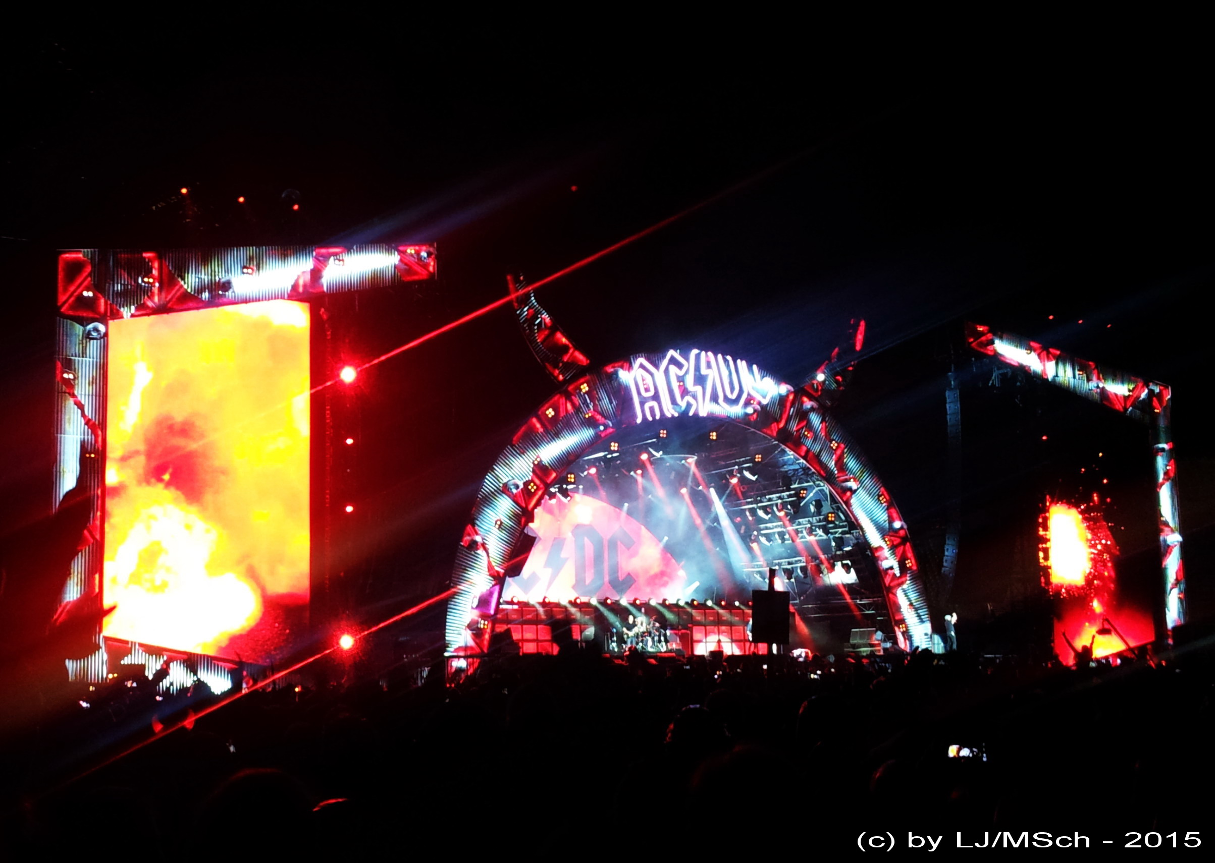 Dunkel wirds mittlerweile, als dann alle Lichter ausgehen und ein Science-Fiction-Clip auf den Videowänden eingespielt wird. Die Amerikaner erobern den Mond und was müssen sie sehen – die australische Flagge weht neben einem glühenden, in Stein gemeißelten Logo von AC/DC. Das Logo löst sich, steuert als Meteor auf die Erde zu und explodiert auf unserem Heimatplaneten. Mit einem Schlag ist alles hell und das Eingangsriff zu „Rock or Bust“, das gleichzeitig der Titeltrack der neuen Scheibe ist, ertönt.