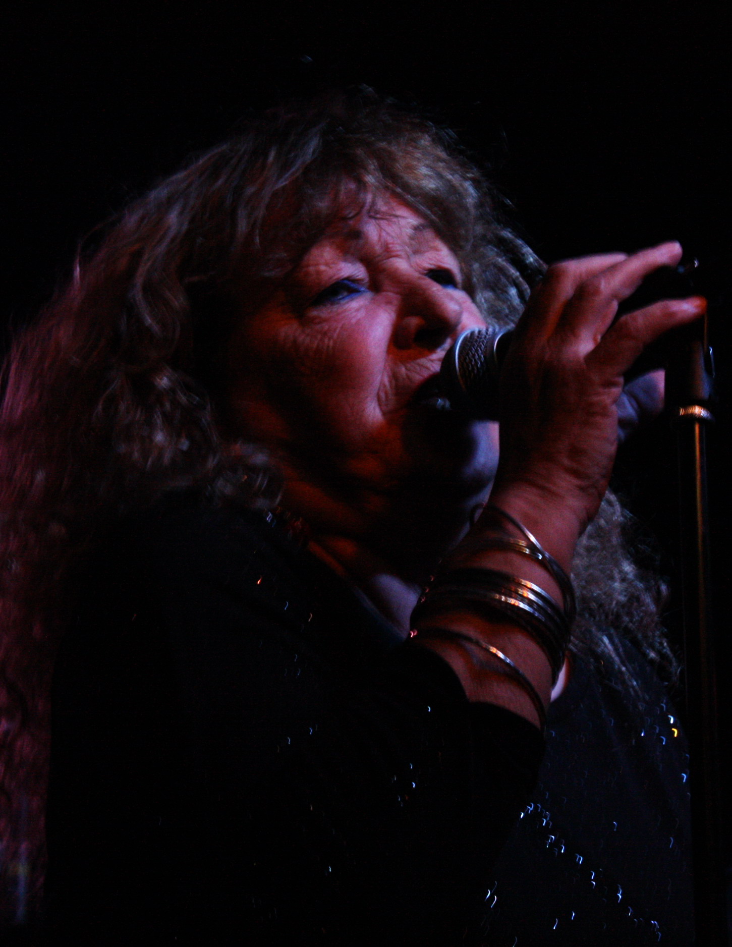 Nach einer halbstündigen Pause geht es weiter. Die ersten Takte rufen auch noch die letzten Raucher in den Saal zurück. Dann wird eine wahre Rockröhre angekündigt. Maggie Bell betritt die kleine Bühne, winkt kurz in die Runde und beginnt mit dem alten Free Song „Wishing well“ ihren Auftritt. Bell gehört zu den besten Bluessängerinnen der Rockgeschichte und nimmt das Publikum durch ihre sympathische Art schnell mit. Laute und leise Töne stimmt die Ex Stone the Crows-Sängerin an, rockt mit ihrer leicht rauhen Stimme durch die Songs und Texte. Dabei sieht man einmal mehr, wie gut die HBB-Mitglieder harmonieren. Keiner übertönt den anderen, keiner findet sich besser oder spielt sich in den Vordergrund. Gekonnt wird miteinander musiziert. Als Maggie einen Part pfeift, setzt Jubel ein. Sie trifft die Töne und schwächelt bei keinem einzigen Pfiff. Es ist eine Freude, der Lady zuzusehen, wie sich lacht, singt, die Hüften zur Musik schwingt und bejubelt wird. Maggie vermittelt etwas sehr Herzliches und Erfrischendes. Dabei ist sie eine ganz natürliche Person, die mit ihrer Stimme begeistert und nicht durch auffälliges Make-up und Klamotten von musikalischen Defiziten ablenken muss. Solche Sängerinnen gibt es eigentlich gar nicht mehr.Auch das Jodeln hat sie gelernt und gibt eine kurze Kostprobe ihres Könnens. Dann geht es aber auch schon wieder gewohnt rockig weiter .
