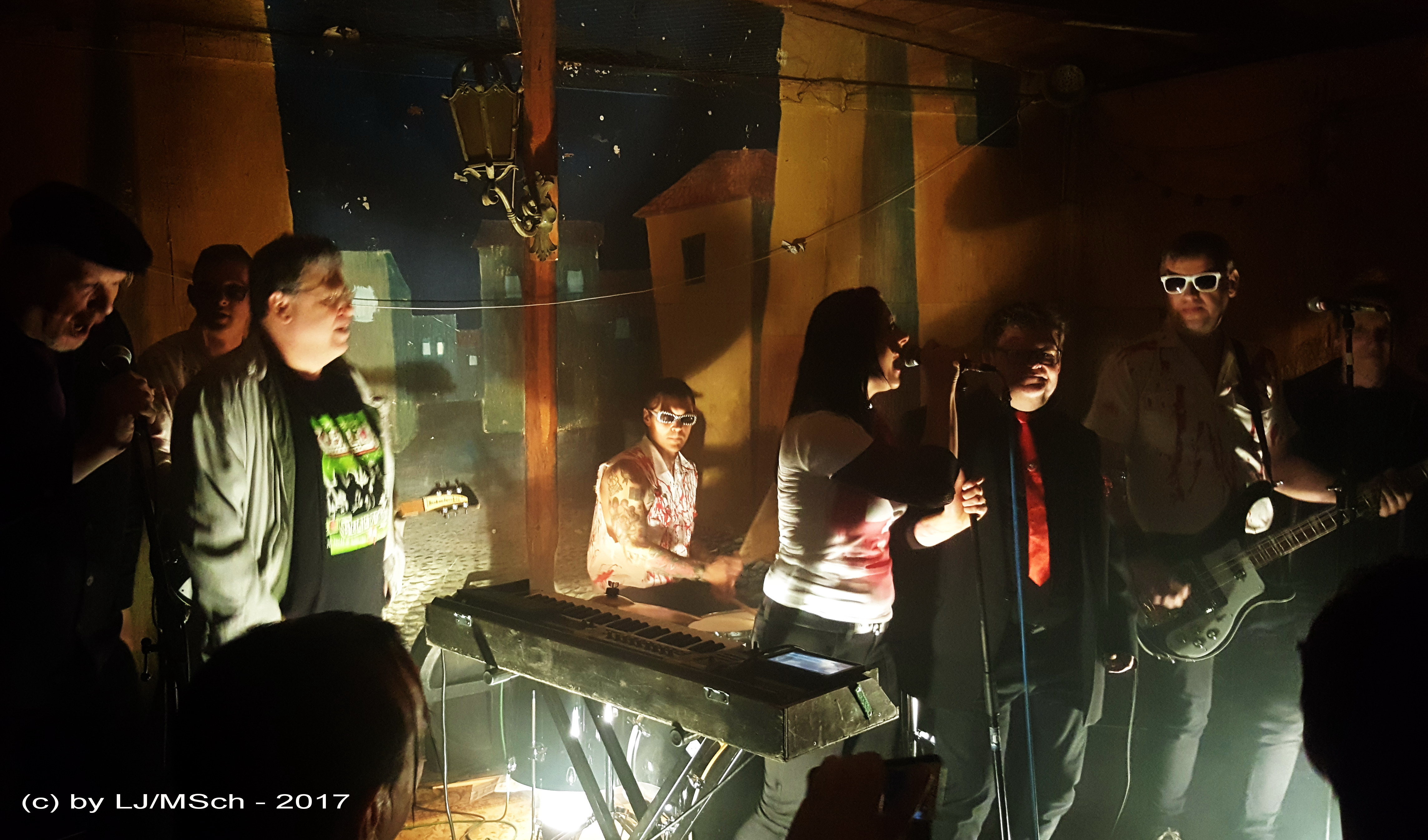 Der Hauptact des Abends sind die US-Amerikaner The Bloodtypes. Die sind wieder richtige Punker, kommen ganz sympathisch rüber und Sängerin Schneck Tourniquet kümmert sich vor dem Konzert noch um Anfragen von Fans. Die Deutsche macht ihre Ansagen auf Deutsch und Englisch, röhrt dann beim ersten Song auch schon ordentlich los. Es ist eine gute Mischung, punkig, rockig, die wirklich mitzieht. Dabei bleibt auch sie auf Abstand und kommt dem Publikum nicht unangenehm nahe. Das Outfit sind mit Kunstblut beschmierte Hemden und Shirts, die zwar für Punks seltsam konform und uniform sind, aber zum gesamten Stil passen.