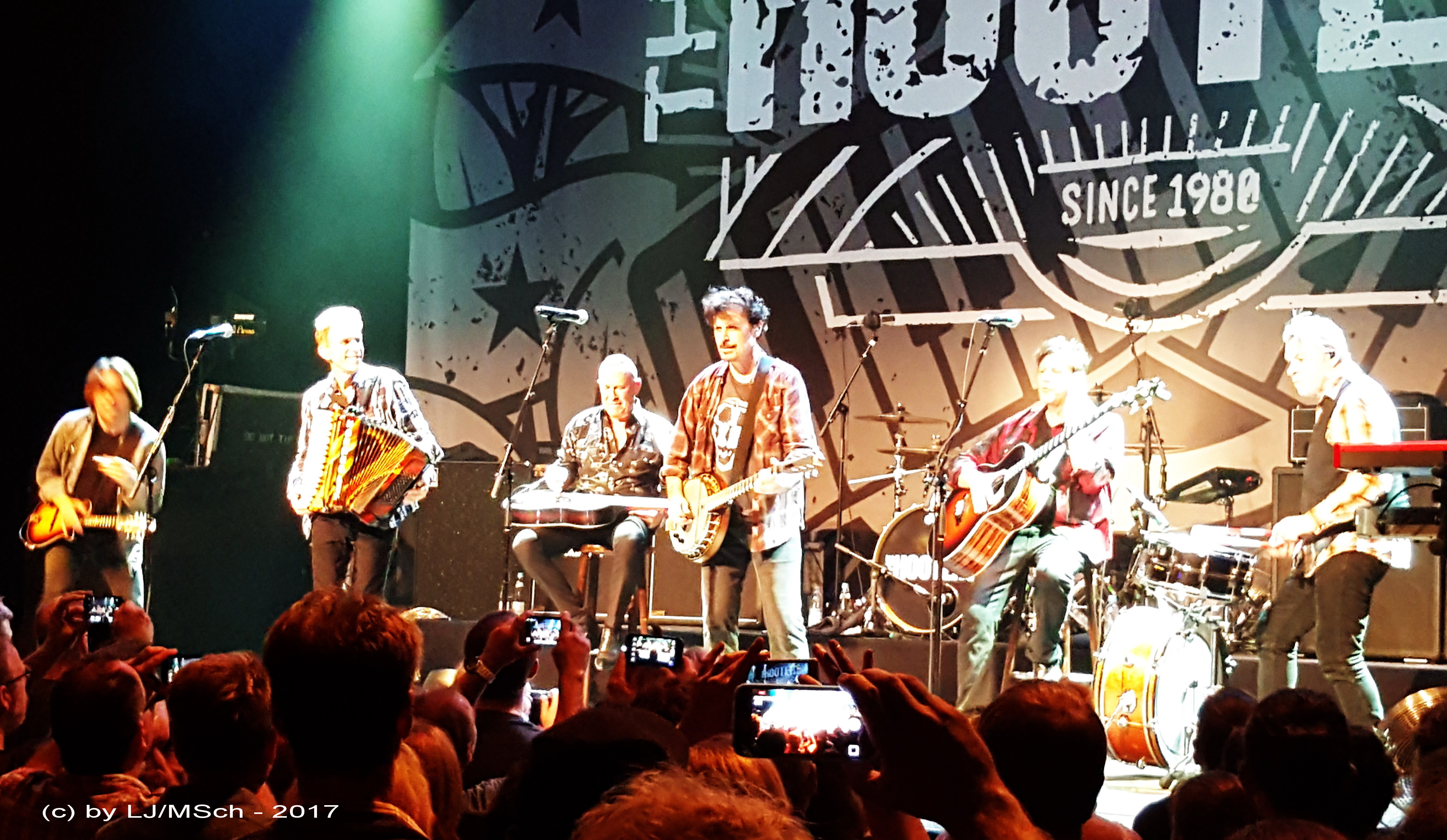 als sich Eric Bazilian wegen einer gebrochenen Schulter keine Gitarre umhängen konnte. Seitdem fest in der Band verankert, sorgte Williams an den Vocals für Gänsehautmomente, als er eine äußerst filigrane Version vom Beatles-Klassiker „Lucy in the Sky with Diamonds“ zum Besten gab. Die Hitrakete startete erneut und läutete den Endspurt ein. „Where do the Children go“, „Karla with a K“ und „Twenty-Five Hours a Day“ brachte die Halle zum Toben. Als kleines Gimmick wurde die Titelzeile im Ausklang wieder auf deutsch gesungen. „Funfunswanssig Stunden am Tag“. Die unverzichtbaren „Jigs n‘ Reels“, die erfahrungsgemäß in „Satellite“ überleiteten, „Johnny B“ und als krönenden Abschluss des regulären Sets „And we danced“, wieder aus der Anfangszeit. Während des Auftritts sorgten Gründungsmitglied David Uosikkinen an der Schießbude und Fran Smith Jr. am Viersaiter für einen soliden Background, auf dem sich Rob Hyman, Eric Bazilian, John Lilley und Tommy Williams gegenseitig die Instrumente in die Hand gaben. Fast ein jeder spielte Melodica, Mandoline und Gitarre … lediglich Akkordeon und Keyboards wurden allein von Hyman bedient. Die Pause vor den Zugaben dauerte maximal fünf Minuten, in denen die Stage-Hands einige Umbauten auf der Bühne vornahmen. Von wegen normale Zugaben – nein – ein kleines Akustik-Set war jetzt an der Reihe. Mit „Deliver me“, „Until i find you again“, „Time stand still“ und Mr.Big Baboon“ welches auf Donald Trump abzielte, wurden die beiden Alben Zig Zag und Time stand still bedient. Die akustischen Instrumente hatten jetzt ausgedient und Tommy Williams