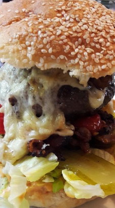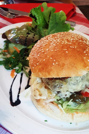 Turm an Zutaten. Nicht nur das Übliche mit Masse draufgepappt, sondern super abgestimmt. Als sie den Burger angeschnitten hatte, konnte man sehen, dass der übliche Fettanteil im Hack fast komplett fehlte. Hier wurde nur das magere Fleisch durch den Wolf gedreht und sehr fein mit Unertl Weißbier abgeschmeckt. Viel leckerer Käse, kross gebratener Bacon und mit der richtigen Menge an Salat zubereitet. Die Burgersemmel war leicht angegrillt. Zusammen mit einem kleinen Salatbuquet angerichtet, war er mit sämtlichen anderen Burgern, die man mittlerweile überall findet, nicht vergleichbar. Hier schmeckte man jede frische Zutat raus. Die Nachspeise bestand aus
