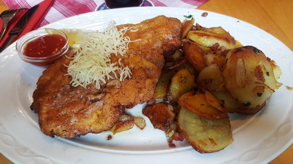Immer wieder nehmen wir die 70 Kilometer Reise auf uns, wenn wir wieder mal vorzüglich speisen wollen, und fahren nach Haag in Oberbayern. Dort gibt’s mit Sicherheit einige gute Lokale, in denen man seinen Hunger stillen kann. Für uns gibt’s aber nur eine einzige Adresse in dem kleinen Ort: Das Unertl Bräustüberl in der Lerchenberger Straße 2 … direkt neben der kleinen Brauerei. Was da auf den Tisch kommt, muss man woanders entweder teuer bezahlen, wenn man dieselbe Qualität auf dem Teller haben will, oder man bekommt diese Köstlichkeiten schlichtweg nicht. Heute war’s mal wieder soweit und wir sind mit einem Freund, dem Münchner Schwammerlkönig, nach Haag gefahren. Angekommen und nach einer herzlichen Begrüßung auch gleich einen schönen Eckplatz am Fenster bekommen, studierten wir die Karte. Man fühlt sich unweigerlich wohl, wenn man im Bräustüberl sitzt. Ein alter Holzboden, ein Kachelofen mittig, Wände teilweise dezent mit Zierkacheln verkleidet und holzvertäfelt. Überall kleine Gestecke und Zeugs aus der Braukunst als Dekor. Hinter dem kleinen Tresen mit der großen Kupfersudpfanne sieht man durch die Durchreiche offen in die Küche, was für mich ein Qualitätsmerkmal ist. Nur was gut ist, muss man nicht hinter verschlossenen Türen verstecken. Beim letzten Mal ließ ich mir den sensationellen Schweinebraten schmecken. Diesen Ausbund an zartem Fleisch, saftigen Knödeln und dem Stückerl extra aufgelegter Kruste (ohne Fettschicht) gibt es mit ziemlicher Sicherheit nirgends in gleicher Qualität. Das superzarte Fleisch kann man fast mit der Gabel alleine zerteilen und Fettschwarten sucht man vergebens. Als Vorspeise hatten wir damals Nudeltaschen mit Wirsing/Bergkäse Füllung. Schweinebraten war eigentlich auch mein Plan für heute … eigentlich. Nachdem unser Freund uns vom leckeren Bierburger vorgeschwärmt hatte, der aber nicht immer auf der Speisekarte steht, entschied sich Kyra für genau denjenigen. Kyra hatte beim letzten Mal das Haager Schnitzel, super lecker mit Senfpanade und frisch geriebenem Meerrettich. Als ich das Schnitzel auf der Karte las, habe ich mich spontan von meinem Schweinebraten verabschiedet und das Haager Schnitzel gewählt.