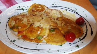 Als Vorspeise gab es wieder Nudeltascherl, diesmal aber gefüllt mit Kürbis/Honig/Ingwer. Eigentlich als Hauptgericht gedacht, aber wir teilten uns das vorab. Geschwenkt in brauner Butter und mit Parmesanraspeln obenauf. Unser Freund entschied sich für die Vorspeise Caesar’s Salat (ohne Anchovisauce) und eben den leckeren Schweinebraten mit Semmelknödeln und Krautsalat. Die Nudeltascherl waren wie zu erwarten war einmal mehr sensationell. Der Hauptgeschmacksteil war der Kürbis, der süße Honig und der scharfe Ingwer hoben sich gegenseitig auf und rundeten den Kürbis ab.