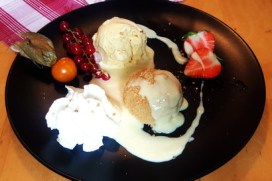 einem Zwetschgenknödel mit einer Kugel Vanilleeis, Vanillesoße und einem Klecks Schlagsahne. Dekoriert mit Erdbeere, Physalis und roten Johannisbeeren. Ich bin normalerweise kein so großer Freund von Vanilleeis, aber das hier war mit normalem Eis aus einer Eisdiele nicht vergleichbar. Hinterher gab’s noch zwei doppelte Espressi und ein sehr schöner Mittag war wieder mal zu verzeichnen.