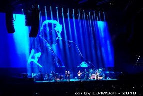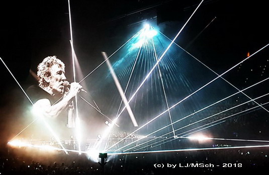 In der Olympiahalle angekommen, sahen wir eine spartanische Bühne ohne großen Aufbau, der Meister hat sowas nicht nötig, außer er lässt die Mauer wieder auferstehen. Die Arena war bestuhlt, sein Publikum ist halt auch nicht mehr das jüngste, trotzdem er mittlerweile auch die Kids seiner alten Fans begeistern kann. So waren trotz einem ziemlich erhöhten Altersschnitt auch viele junge Fans in der Halle. Ein paar Minuten nach Acht gings dann los. Das Saallicht erlosch und die ersten Töne vom Band erklangen als Intro. „Speak to me“ aus dem The dark Side of the Moon Album bildete den Opener für „Breathe“, ebenfalls aus dem 73er Album. Waters wurde sofort bejubelt und gefeiert. Großflächige Videoprojektionen bilden den Hintergrund der Stage. Ein markanter Basslauf zu Beginn des nächsten Songs ließ mein Herz höher schlagen. Als alter Pink Floyd Fan kannte ich natürlich den Song, der jetzt kommen sollte. „One of these Days“ vom 1971er Album Meddle ist seit über 30 Jahren einer meiner Lieblingssongs der Band. Dem Applaus-Orkan zu urteilen anscheinend nicht nur meiner. Mit dem Ticken und Läuten vieler Uhren und Wecker ging es umjubelt wieder zurück zu einem der legendärsten Alben der Musikgeschichte – The Dark Side of the Moon. „Time“, gefolgt von „Breathe (Reprise)“ und „The great Gig in the Sky“ wurden allesamt bejubelt. Auf Dark Side folgte zwei Jahre später ein nicht minder berühmtes Album. Wish you were here hieß das Meisterwerk, welches eine Hommage an den Pink Floyd Mitgründer Syd Barrett war und ist. Das weltbekannte Cover mit dem brennenden Mann aus der Graphikschmiede Hipgnosis ist wohl eines der bekanntesten Motive auf einer Plattenhülle, wie auch das Prisma im Schwarzen von der Dark Side. „Welcome to the Machine“ aus diesem Werk wurde jetzt gespielt und zurecht bejubelt. Doch zurück in die Zukunft war jetzt angesagt. Is this the Life we really want? lautet der Titel von Waters‚ letztem Solowerk aus dem vergangenen Jahr. Daraus kamen die Songs „Deja Vu“, „The last Refugee“ und „Picture that“ an die Reihe, ehe Waters wieder ins Jahr 1975 zurückkehrte und den Titelsong an der akustischen Gitarre anstimmte, in dem er den Weggang von Syd Barret bedauerte. „Wish you were here“ wurde mitgesungen und bejubelt. Der Applaus ebbte nicht ab, als gleich darauf Hubschraubergeräusche zu hören waren. Jeder wusste, was jetzt kommt. „The happiest Days in our Live“, gefolgt vom Megahit „Another Brick in the Wall – Part 2“ und Part 3 bildeten den Abschluss des ersten Teils des Konzertes. Anschließend wurde eine 20-minütige Pause eingelegt. So manche Blase dankte es Waters, ja ja – das Alter des Publikums …