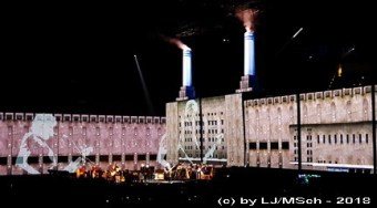 Zu Beginn des zweiten Teils durchdrangen rote Blinklichter das Dunkel in der Halle und der Schriftzug DOGS war hinter der Bühne in leuchtendem Rot zu lesen. Das 1977er Album Animals kam anscheinend jetzt an die Reihe. Ein gefühlt 50 Meter langer Rahmen, an dem die Blinklichter kreisten, senkte sich auf die komplette Länge der Olympiahalle nach unten bis kurz über die Köpfe der Besucher in der Arena. Eine dröhnende Geräuschkulisse sorgte für eine bedrohliche Atmosphäre. Unter Getöse und Dampfschwaden tauchten auf einmal vier Schlote aus dem Rahmen auf und schoben sich nach oben. Dem Publikum stockte der Atem als sich die Schlote zu einer gigantischen kompletten Battersea Powersea Station auswuchsen, die da aus dem Nichts enstand, dem Covermotiv des 77er Animals Albums. Inklusive dem berühmten Schwein, das zwischen zwei Kaminen schwebte. Dieses Fabrikmotiv als optisches Etikett für die Technologisierung und der daraus entstandenen Kommerzialisierung hernehmend, tauchten jetzt zunehmend politische Botschaften im Bühnenbild auf. Beim nächstfolgenden Song „Pigs (Three different ones)“ benutzte Waters das Konterfeit eines seiner ärgsten Feindbilder als Hauptmotiv seiner Projektionen. Donald Trump war und ist für Waters das Oberschwein dieser Welt. Trump, der amerikanische Oberclown, der sich einen Dreck um das schert, was viele Leute vor ihm zum Schutze der Natur, der Minderheiten, der einfachen Leute in den USA aufgebaut hatten. Der stattdessen nur auf Profit aus ist, koste es, was es wolle. Diese Ablehnung zeigt Waters sehr deutlich in großen Lettern. Trump ist ein Schwein stand da in deutscher Schrift zu lesen. Zum Song schwebte auch wieder das riesige aufblasbare Schwein durch die Halle, auf dem zu lesen stand: Stay human und Bleibe menschlich. Um Profit geht’s auch im folgenden Song, wieder vom Dark Side Album. Registrierkassenklingeln kündigte einen der größten Hits von Pink Floyd an. „Money“ bretterte durch die Halle und wurde begeistert angenommen. Bezeichnend für Waters das Konterfeit des Herrn Mark Zuckerberg an der Videowand beim Thema Money. Mit „Us and them“ von der gleichen LP gings weiter, ehe mit „Smell the Roses“ wieder das neueste Solowerk von Waters an der Reihe war. Mittlerweile war nicht mehr nur der amerikanische Trump(el) das Hauptmotiv der Projektionen. Nein – Waters wetterte allgemein über den wiederkehrenden Faschismus dieser Tage. Farage, Orban, Le Pen, Kurz und Putin … alle standen da zu lesen. Putins Name mit einem Fragezeichen versehen. RESIST, auf deutsch WIDERSTEHE stand in großen Lettern oft zu lesen an der Wand. Widersteht den extremistischen Strömungen lautete Waters‚ Botschaft. Roger Waters stellte sich auf die Seite der Unterdrückten in vielen Staaten dieser Erde. Auch eben auf die Seite der Palästinenser, die mehr als offensichtlich vom Staate Israel unterdrückt werden. Diesen Zusammenhang hat der Münchner Oberbürgermeister anscheinend nicht verstanden oder wollte ihn nicht im allgemeinen Waters-Kontext sehen. Das hat in keinster Weise mit Antisemitismus zu tun, sondern mit der Ablehnung der Machenschaften des Staates Israel. Aber klar – mit der Antisemitismus-Keule argumentiert es sich halt viel leichter. Reiter – setzen – Sechs. Beim nächsten Mal bitte den allgemeinen Kontext betrachten und nicht nur da,s was anscheinend mit der deutschen Vergangenheit zu tun hat. Auch die Gegenwart zählt, und Waters zeigt die gegenwärtigen Strömungen deutlich auf. Er nahm auch die Gelegenheit wahr, um auf das Statement von Dieter Reiter in einen Ansprache einzugehen – in nicht zu sanften Worten. Bei so manchem Politiker ist der Titel des folgenden Songs anscheinend Teil seiner Karriere. „Brain
