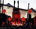 Pianoklänge durchzogen nach ein paar Minuten Ruhe das Stadion, als das Duo Jatekok auf der Nebenbühne zusammen mit Rammstein den „Engel“ performten. Eine gute Idee, ihren wohl größten Hit in einer komplett anderen Version zu bringen. Anschließend brachte die erste Zeile „Ich werde in die Tannen gehen“… die 70.000 wieder außer Rand und Band. Dem dezenten Hinweis von der Bühne auf Handylichter ließen abertausende Fans Taten folgen und tauchten das Areal in ein Lichtermeer. Die Ballade „Ohne dich“ ist auch einer der heimlichen Hits der Rammstein-Fans. Gefolgt von „Seemann“, bei dem die Band mal das zelebrierte, was sonst nur Keyboarder Flake darf. In Schlauchbooten setzte die komplette Band quer über die Woge aus Händen der Fans über zur Hauptbühne. Mit großem Verbeugungszeremoniell beschloss Rammstein das Hauptset ihrer heutigen Show. Es dauerte aber nicht lange als die Keyboardklänge aus Flakes Tasten den „Ausländer“ einleiteten. „Du riechst so gut“ und „Pussy“ wurden gefeiert, als ob#s kein Morgen mehr gäbe. Und wieder ein kurzer Abgang von der Bühne. Die Textfragmente „…ein Mensch brennt … ein Flammenmeer … Fleischgeruch liegt in der Luft … Blut gerinnt auf dem Asphalt … ein Kind stirbt … Mütter schreien“ kennt wohl jeder Rammstein-Fan. Das Flugzeugunglück 1988 auf der Flugzeugshow der US Air-Base Ramstein in Rheinland-Pfalz mit 70 Toten und ca. 1.000 Verletzten war der Namensgeber der Band. Und eben jenen namensgebenden Titeltrack brachte Rammstein jetzt dar.