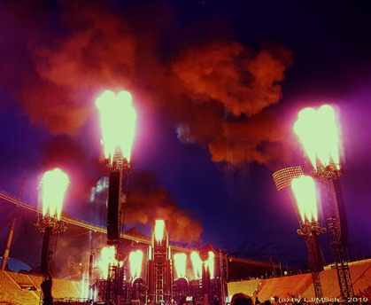 „Mein Teil“ von 2004, welches das Thema des Kannibalen von Rothenburg aufzeigt, wurde gefeiert und bei den ersten Klängen des Intros von „Du hast“ erreichte die Stimmung einen Höhepunkt. Was jetzt folgte, ließ einen zugleich frösteln und vor Hitze erschauern. Die Lightshow von Rammstein war ja immer schon von knalligen Farben und Kontrasten in Verbindung mit Flammen und Rauch bestimmt. Aber beim Refrain von „Du hast“ spuckten die Stahlmasten überall riesige Flammensäulen nach oben aus, so gewaltig, dass Hitzewellen das Stadion durchliefen. Wir standen ja fast ganz hinten und uns wurde ziemlich warm. Wie gewaltig musste die Hitze vorne drin sein? – Inmitten der ganzen Feuersäulen. Geht das noch zu toppen? Um es vorweg zu nehmen – es geht!
