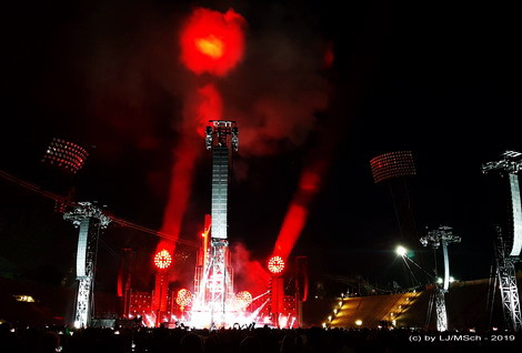 Pianoklänge durchzogen nach ein paar Minuten Ruhe das Stadion, als das Duo Jatekok auf der Nebenbühne zusammen mit Rammstein den „Engel“ performten. Eine gute Idee, ihren wohl größten Hit in einer komplett anderen Version zu bringen. Anschließend brachte die erste Zeile „Ich werde in die Tannen gehen“… die 70.000 wieder außer Rand und Band. Dem dezenten Hinweis von der Bühne auf Handylichter ließen abertausende Fans Taten folgen und tauchten das Areal in ein Lichtermeer. Die Ballade „Ohne dich“ ist auch einer der heimlichen Hits der Rammstein-Fans. Gefolgt von „Seemann“, bei dem die Band mal das zelebrierte, was sonst nur Keyboarder Flake darf. In Schlauchbooten setzte die komplette Band quer über die Woge aus Händen der Fans über zur Hauptbühne. Mit großem Verbeugungszeremoniell beschloss Rammstein das Hauptset ihrer heutigen Show. Es dauerte aber nicht lange als die Keyboardklänge aus Flakes Tasten den „Ausländer“ einleiteten. „Du riechst so gut“ und „Pussy“ wurden gefeiert, als ob#s kein Morgen mehr gäbe. Und wieder ein kurzer Abgang von der Bühne. Die Textfragmente „…ein Mensch brennt … ein Flammenmeer … Fleischgeruch liegt in der Luft … Blut gerinnt auf dem Asphalt … ein Kind stirbt … Mütter schreien“ kennt wohl jeder Rammstein-Fan. Das Flugzeugunglück 1988 auf der Flugzeugshow der US Air-Base Ramstein in Rheinland-Pfalz mit 70 Toten und ca. 1.000 Verletzten war der Namensgeber der Band. Und eben jenen namensgebenden Titeltrack brachte Rammstein jetzt dar.