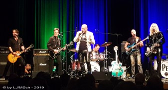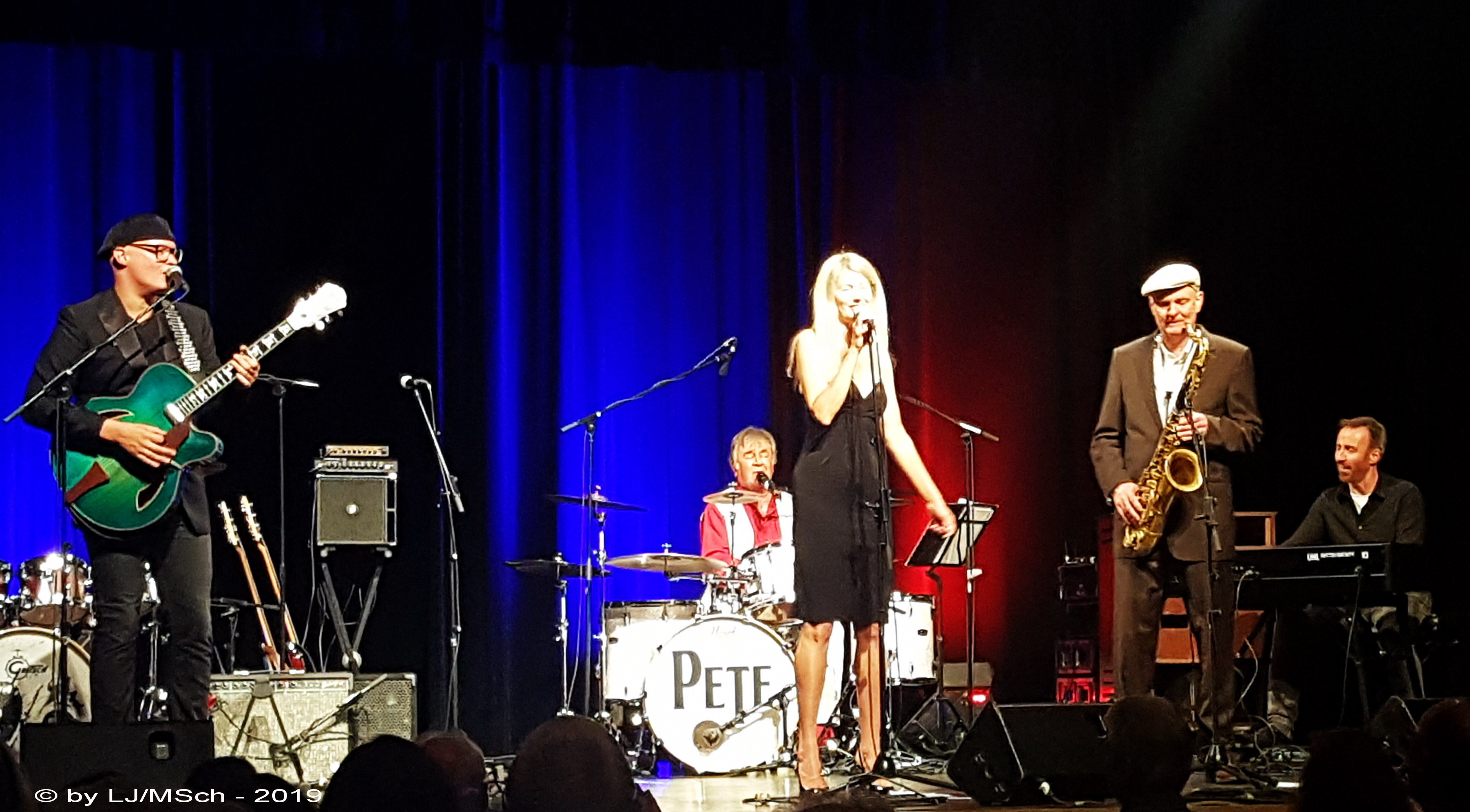 Nach einer kurzen witzigen Ansage legten die Mannen auch gleich los mit einem der Superhits der 60er. „Keep on running“ von der Spencer Davis Group. Das war natürlich der perfekte Einstieg in einen vergnüglichen Abend. Nach einem Hinweis seitens Pete, dass Cher heute nicht hier sein könne, weil sie mit Sonny woanders spielen müsse, stellte Pete klar, dass sie heute ihre eigene Cher hier hätten und stellte die aus Vancouver/Kanada stammende, aber aktuell in München lebende Sängerin Nina Michelle vor. Mit Sängerin kam jetzt der Sonny und Cher Hit „The Beat goes on“ an die Reihe. Anschließend wurden „Sister Sadie“ und „Cute“ dargeboten, ehe der nächste Spencer Davis Hit „Somebody help me“ das Publikum wieder zu Applausstürmen hinriss. Auch die letzten beiden Songs stammen aus der Feder der englischen Band. „I’m a Man“ und „Gimme some loving“ ließen alle mitsingen und klatschen und nach vergnüglichen 45 Minuten räumte die Band die Stage und eine kleine Pause war angesagt. Dem Alter des Publikums geschuldet, ist das wohl angebracht.