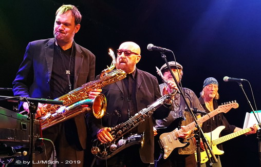 Das Publikum heute konnte man in drei Gruppen einteilen. Die erste Gruppe, vorwiegend die jüngeren, kamen in erster Linie wegen Roger Glover. Zigfache Handyfotos und Videos, in denen Glover im Spot war, sprachen eine deutliche Sprache. Wann sieht man diesen Mann schon mal in einem kleinen Club? Die zweite Gruppe, vorwiegend die Älteren, kamen wegen des seltenen Gasts Zoot Money. Der Rest einfach nur wegen der genialen Zusammenstellung dieser Allstar-Band. Ein alter Blues Standard von Chester Burnett, „Smokestack Lightning“ wurde in einer ziemlich langen Version gespielt, die grandios ankam bei den Leuten. Bei einigen Songs war ein zweiter Saxofonist mit auf der Bühne. Jürgen „Big Jay“ Wieching, der schon bei Albie Donnelly’s Supercharge das Bariton-Sax geblasen hat. Das Zusammenspiel von Wiechings Bariton-Sax und dem Tenorsaxofon von Donnelly passte hervorragend zum Rhythm ’n Blues Sound des Rock & Blues Circus. Mit „Little Man“ beendete die Band ihr erstes Set und legte eine gut 20 minütige Pause ein – dem Alter von Musikern und Publikum entsprechend.