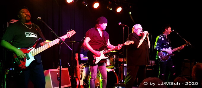 Am Schlagzeug saß nicht wie ursprünglich angekündigt Eddie Filipp, sondern der junge Brite Kev Hickman aus der Band von Krissy Matthews. Los ging’s wie fast immer mit „Rockin‘ Chair“ und „Stony Times“, welches die Anwesenden sofort auf Betriebstemperatur brachte. Nach „Can’t last forever“ kamen zwei Songs vom Gitarren-Wunderkind Krissy Matthews, „It ain’t worth it“ und „Is this the Love I think it is?“ an die Reihe, die auch gehörig fetzten. Nach „Into the Night“ erzählte Gert Lange von den zahlreichen Gästen, die immer wieder bei der HBB mitspielen. Einer davon war Micky Moody (Juicy Lucy, Whitesnake), aus dessen Feder das folgende „Get off my back“ stammte. Gert erzählte dem Publikum, dass Reggie ja früher bei Ike and Tina Turner gespielt hatte, und einen derer größten Hits durfte er jetzt singen. Das legendäre „Nutbush City Limits“ in einer dahinstampfenden Version, ehe wieder Krissy Matthews mit seinem „Bubbles“ ein eigenes Stück performen durfte. Das abschließende „City Heat“ geleitete die Zuschauer in die kurze Pause. Den ersten Set des Abends spielte die HBB meiner Meinung nach etwas mit gebremsten Schaum. Vielleicht der Tatsache geschuldet, dass mit Hans und Bexi zwei tragende Säulen des HBB-Gerüsts nicht dabei waren. Vielleicht auch die Tatsache, dass der Gesundheitszustand von Hans Wallbaum etwas auf die Gemüter schlug.
