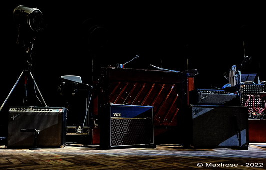 Auf dem Weg zur Halle sah ich bereits zwei große Lkw voller Equipment. Das war schon beeindruckend. Der Grund dafür zeigte sich auf der Bühne. The Analogues haben eine Vielzahl Instrumente und Verstärker, original aus der Zeit der Aufnahmen.