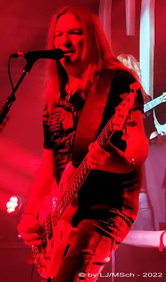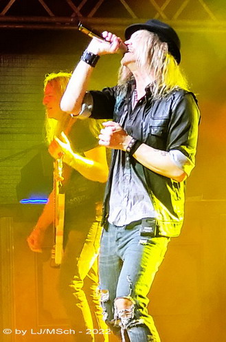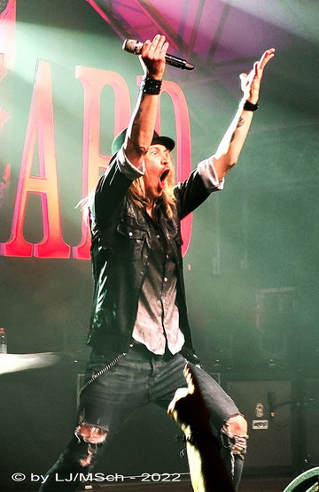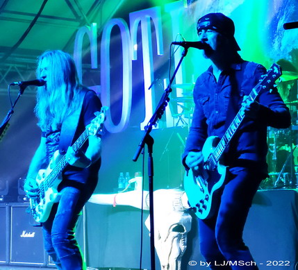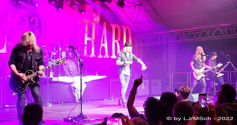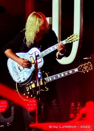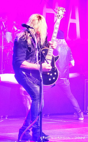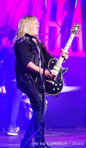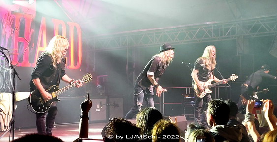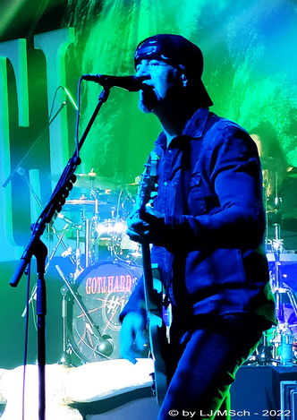 Nach eine guten halben Stunde Umbaupause enterten dann die Eidgenossen zu den krachenden Gitarrensalven aus den Sechssaitern von Gründer Leo Leoni und Freddy Scherer die Stage. Leoni hatte 1990 zusammen mit dem legendären Steve Lee und Bassmonster Marc Lynn die Vorgängerband Krak aus dem Taufbecken gehoben aus der dann Gotthard wurde. Freddy Scherer ist ja auch schon seit 2004 dabei. Sofort wurden die Schweizer gefeiert und mit „Every Time I die“ und „10.000 Faces“ vom neusten Album #13 ging’s auch gleich in die Vollen. Gotthard sind immer wieder für eine Coverversion gut, und eine solch krachende kam als folgender Song. Im Original von Joe South 1968 geschrieben, aber von Deep Purple so richtig bekannt gemacht, fegte jetzt „Hush“ durch die Tonhalle ehe mit „Missteria“ wieder der aktuelle Longplayer beworben wurde. Der originale Shouter Steve Lee fiel 2010 leider einem tragischen unverschuldeten Verkehrsunfall zum Opfer. Seit November 2011 ist der Schweiz-Australier Nic Maeder die Nachfolge am Mikro angetreten. Maeder machte ein paar Ansagen, wie sehr er und die Band es freute, endlich wieder auf Tour und hier in München zu sein, was groß bejubelt wurde. Man merkte in jeder Sekunde, dass die Leute ausgehungert waren nach Livesound. Und der wurde ihnen geboten. Mit “Stay with me”, “Feel what I feel”, “Top of the World”, “The Call”, “What you get” und “Master of Illusion” wurde ein schöner Querschnitt durch fast alle Alben der letzten 20 Jahre dargeboten. Mit “Let it rain”, “One Life, one Soul” und “Sweet little Rock’n’Roller” gings dann zurück ins letzten Jahrhundert, was etwas besser ankam als die neueren Songs. Auffallend war, dass viele Songs von der Stimmung ähnlich gleich klangen. Die Vorband Magnum wurde da teilweise schon mehr bejubelt. Handwerklich konnte man Leoni und Co. nichts vorwerfen. Über 30 Jahre auf den großen Bühnen der Welt zuhause wissen die, wie’s geht. Eigentlich wäre ja fast noch ein weiteres Gründungsmitglied dabei, hätte sich nicht Drummer Hena Habegger seit 2019 eine persönliche Auszeit genommen, um mehr Zeit für seine Kinder und Frau zu haben. Aus diesem Grund trommelt seit 2019 Flavio Mezzodi bei Gotthard und der macht seine Sache sehr ordentlich. Im Zusammenspiel mit Basser Marc Lynn legt er den soliden Grundstock, auf dem sich die beiden Axemänner Leoni und Scherer ihre Duelle liefern können. Mit „Mountain Mama“ ging es ganz weit zurück in die Anfangsjahre, ehe mit „Remember it’s me“ und „Starlight“ wieder die Neuzeit zum Zuge kam. Schlagwerker Mezzodi durfte dann sein Können ganz allein an den Kesseln beweisen, ehe mit „Lift U up“ vom 2005er Album Lipservice den regulären Set abschloss. Den Anfang der Zugaben machte „Heaven“ aus dem Jahre 2000 ehe Gotthard sich mit einem der größten Hits der Schweizer, „Anytime anywhere“, von der Bühne verabschiedete. Lauter Jubel und Zugaberufe lockten Gotthard wieder zurück on Stage und eine erneuten Coverversion, „Quinn the Eskimo“, im Original als „Mighty Quinn“ von Bob Dylan geschrieben, machte dann endgültig den Deckel drauf.
