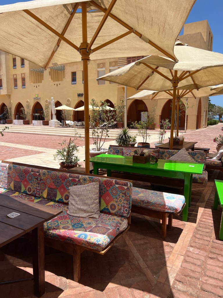 Man kriegt direkt eine tolle Stimmung mit, sowohl am Tag, wenn auch brutal anstrengend, durch die drückende Hitze, als auch am Abend, wenn alles schön beleuchtet ist. Beides hat etwas Tolles an sich. Hier gibt es ebenfalls viele Restaurants, die einen moderneren und ausgefalleneren Eindruck machen als in Downtown, mit Ausnahme von Bongoyo. Und es gibt auch die noch im Kafr El Gouna vermissten ägyptischen Boutiquen. Jedoch auch immer mit einem kleinen Fakeanteil, aber das ist nicht schlimm. Wenn wir das nächste Mal nach El Gouna reisen, werden wir uns wohl eher in diesem Bereich aufhalten, wobei die Reisezeit vom Hotel ungefähr fünf Minuten beträgt.