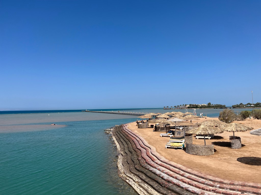 Nun zum Problem oder besser gesagt enttäuschenden Teil. Die Insel Zeytouna Beach, die zum Hotel gehört und somit den hoteleigenen Strand darstellt, respektive ersetzt, ist leider nicht gerade das Gelbe vom Ei. Insbesondere dadurch, dass nicht klar wird, welcher Teil uns als Hotelgästen zusteht, da auch andere Hotels wie beispielsweise das Sheraton auch Teile „besitzen“ und die gesamte Insel wieder zu einem anderen Hotel gehört, nämlich zum Three Room Hotel. Also große Verwirrung. Auf der rechten Seite befindet sich ein Bootsanleger, wodurch man konstant Schiffsmotoren hören kann, wenn man dort liegt. Auf die Seite zum Meer hin hätten wir hingedurft. Schön und gut sollte man meinen, vor allem mit dem ewig langen Steg im Blick. Jedoch ist das Wasser dort mauskniehoch und es wird einem geraten, nur mit Badeschuhen das Wasser zu betreten. Zudem war auch die Klientel dort nicht ganz so angenehm, um zu entspannen und zu lesen. Auf der linken Seite waren der Teil des Sheraton und auch das Hotel im Hintergrund zu sehen. Hier war es sehr schön und nichts los. Dort haben wir die ersten Tage verbracht ohne zu wissen, dass dieser Teil gar nicht für uns gedacht war, bis wir schließlich weggeschickt wurden. Man hätte auch 350 EGP, also 15 € pro Person bezahlen können, aber das fanden wir ein wenig unsinnig. Also Zeytouna Beach kann man machen, muss man aber nicht zwingend. Schade, das Potential war da.