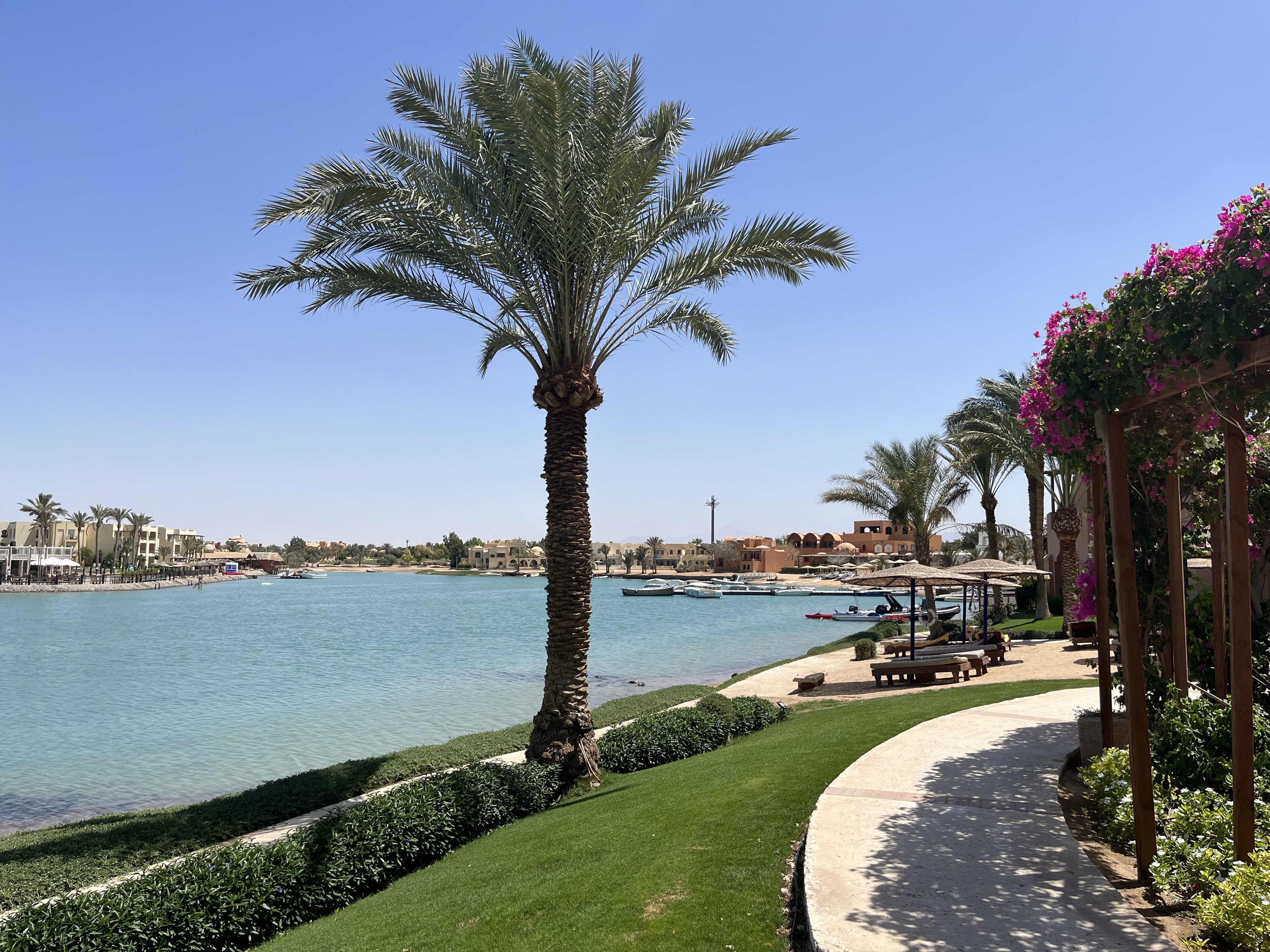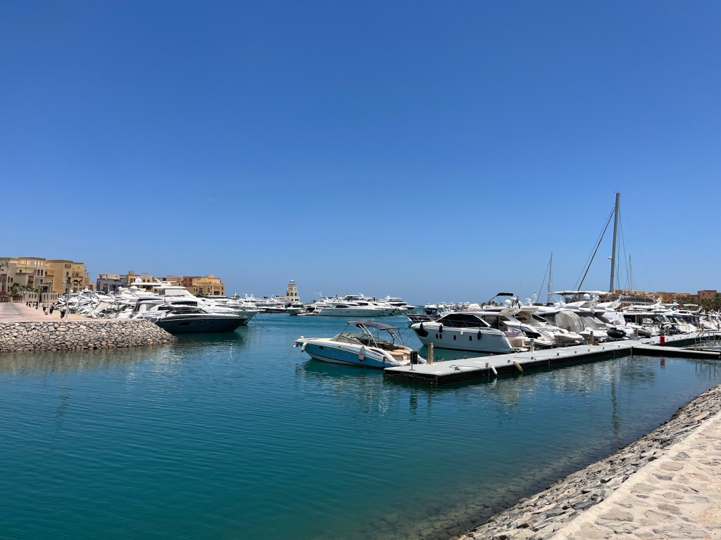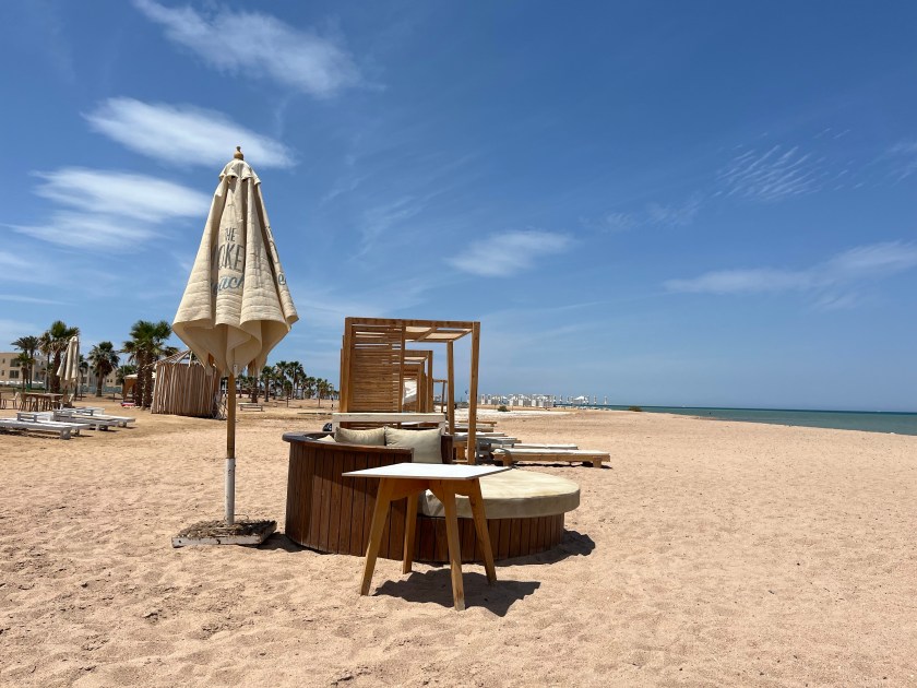 Auf Ahmeds Empfehlung hin sind wir mit dem Tuk Tuk hierhin gefahren. Der Strand ist privat und mit schönem Sand ausgestattet. Es gibt Sonnenliegen, -betten, & -couchen, auf denen man es sich gut gehen lassen kann. Das Personal ist auch hier sehr nett. Das Konzept der Bezahlung ist interessant. Man zahlt pro Person 400 EGP, also 20€ Eintritt und kann diese auch verzehren und hat Recht auf alle Liegeoptionen. Zu Beginn sehr verwirrend, aber in meinen Augen ein gutes System. Das Meer ist sehr schön und durch die Nähe zur Marina hat man nach rechts einen schönen Ausblick auf die Yachten, links auf die Kitesurfer und in der Mitte das blaue Meer pur.