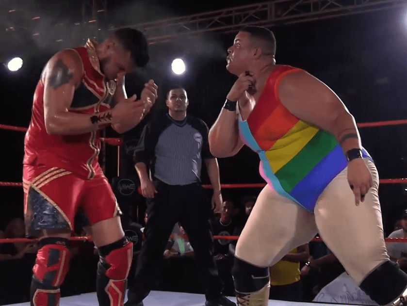 Es gibt noch eine tolle, wichtige Botschaft, die den nächsten Kampf betitelt: Unabhängig von Geschlecht oder Orientierung, es ist egal, was oder für wen Gefühle sind, Liebe wird niemals aufhören Liebe zu sein. Es tut gut zu sehen, dass man bei LAWE und überhaupt in Puerto Rico sehr offen ist für die LGBTQ+ Gemeinde, dass es schnurzegal ist, ob man hetero, homo, trans ist – und wenn wir alle mal ganz ehrlich zu uns selbst sind: Es ist auch verdammt egal und sagt einfach nichts über einen Menschen. Also packt Hass und Vorurteile endlich weg – und lieber Profisport: Nehmt euch mal ein Beispiel an Puerto Rico und der dortigen Wrestlingwelt, die sehr offen und sehr normal mit Homo- und Transsexualität umgeht! Pulli La Bella hatte damit seinen Entrance, dann kommt Jon Justice in schöner und sehr spezieller Begleitung. Viele Fans hat er an diesem Abend erstmal nicht. Es gibt viel Diskussionsbedarf außerhalb des Rings, Gürtel werden geschwungen, etwas sehr Typisches für Puerto Rico, zugeschlagen soll dann doch nicht werden, ausnahmsweise. Erster Pinversuch von Pulli. Justice wirkt angeschlagen, fliegt aus dem Ring, wird nun doch mit Gürteln geschlagen. Es ist ein abgesprochenes Spiel, dennoch bekommt es schnell einen sehr bitteren Beigeschmack. Das harte Lachen, unverständliche Zwischenrufe, die Schläge, Klatschen, ein Aufwiegeln. Fast ist es ein großes Schauspiel, das nicht ernstnimmt, was geschieht und die auslacht, die dort im Ring stehen. Als Außenstehender hat man den Eindruck, dass es hier nicht um Wrestling geht, sondern um die symbolische Wirkung. Auch nicht schlecht. Schließlich knockt Justice seine Begleitung aus und gibt Pulli damit die Chance, den Sieg einzustreichen. Das schreit schon wieder nach Rache, kaum dass bis drei gezählt wurde. Doch wie wir in den Wochen danach erfahren, fällt Pulli verletzungsbedingt erstmal aus. Auch ihm wünschen wir gute Besserung! Jetzt geht es um die Botschaft, die bereits zu Beginn erwähnt wurde, Schilder werden im Publikum hochgehalten, darunter „Nein zu Rassismus“, aber vor allem: Wir sind alle gleich. „LAWE, todos somos familia“ – Wir sind eine Familie.