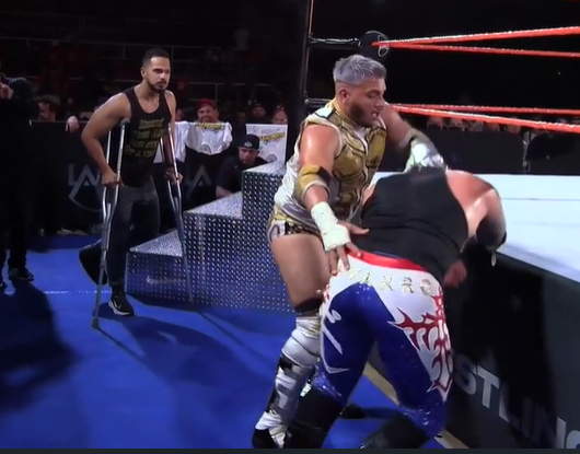 Ein paar Dinge fallen auf. Es ist das erste Match, in dem Mendoza nicht ständig den Sitz seiner Hose korrigiert oder sich durch die Haare fährt. Außerdem wirkt er noch muskulöser, als hätte er in den Wochen vor dieser Nacht in seinem Studio gelebt und nochmal ein paar Kilo Muskelmasse hinzugewonnen. Der Rücken und die Oberarme wirken noch stärker, definierter. Und Colon? Gefühlt habe ich ihn noch nie so gesehen. In seiner WWE-Zeit waren das eben bravere Matches, familienfreundlich. Er wirkt dennoch ein bisschen außer Form, ein bisschen schneller erschöpft, er ist auch älter, ja. Und es ist keinesfalls so, dass er das Opfer ist, das nur einsteckt, ganz im Gegenteil.