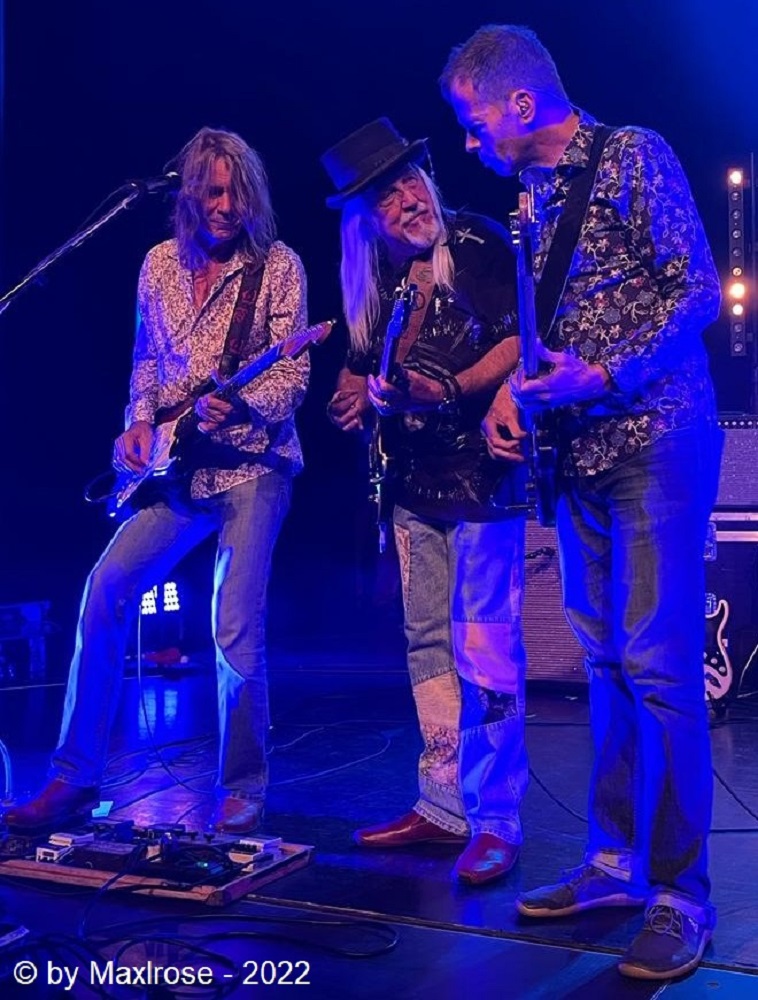 Nach einer etwas längeren Umbauphase kam mit dem dritten Act des Abends die einzige Band auf die Bühne, die in der Originalbesetzung auftrat. Mit dem Jazzrock von Kraan hätten wir auch das dritte Genre. Das Trio aus den Brüdern Peter Wolbrandt an der Gitarre, Jan Fride Wolbrandt am Schlagzeug und Hellmut Hattler am Bass wird durch einen jungen Keyboarder bei einigen Songs ergänzt. Kraan ist zudem die einzige Band des Abends, die Bilder auf eine Leinwand projizieren. So beispielsweise auch das Matterhorn. Die Band hat selbst Jahre lang in Wintrup in der Nähe des Veranstaltungsorts gelebt und musiziert, wodurch dieser Auftritt sichtlich etwas Besonderes für sie war. Die Ansprachen zwischen den Songs wirken sehr emotional und ehrlich. Hellmut Hattler ist total begeistert von dem Event, aber nicht nur er. Bei Kraans Auftritt ist das Publikum zum Teil völlig fanatisch und rockt die Halle. Die Songs sind sehr mitreißend und virtuos gespielt. Peter Wolbrandt lässt seine Stratocaster glühen. Sein Bruder gibt richtig Gas an der Schießbude und Hellmut Hattler legt mit seinem Bass einen Lauf nach dem anderen hin. Insbesondere bei dem Stück „Borgward“ flippen alle aus – Band und Publikum. Auch der Song „Pick Peat“ vom neuen Album Sandglass fällt nicht ab vom Sound. Bei Kraan muss man einfach mitfühlen und mitgehen. Die Melodien sind eingängig und verleiten direkt zum Tanzen, Schaukeln, bei einigen auch zum Mitgrölen. Wie gesagt, es ist für jeden etwas dabei. Leider war der Sound dadurch, dass sie die lauteste Band des Abends waren, streckenweise etwas dumpf. Trotzdem ein mitreißender Auftritt