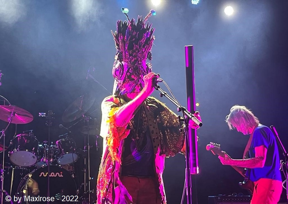 Auf den harten Krautrock folgt mit Guru Guru eine Band mit Free Jazz Elementen, kaum Gesang und sehr groovigen Stücken. Vorweg gesagt: der Gründer und Drummer Mani Neumeier ist 81 Jahre alt! Einundachtzig! So viel zur Eröffnungsfrage. Die Antwort wird im Text ihres größten Hits „Elektrolurch“ erklärt, aber für den heutigen Abend ist diese wohl: „Wir werden immer noch spielen, heute spielen wir in Paderborn und das verdammt gut“. Von Neumeiers Alter merkt man nicht viel; er rennt zum Teil über die Bühne und klopft satten Sound auf seinen Fellen. Der Multiinstrumentalist Roland Schaeffer, der schon in den 70ern bei Guru Guru war, begeistert das Publikum mit Gitarre, Saxophon, indischer „Tröte“, Klangschellen und Sounds. Zudem noch Peter Kühmstedt am Bass, auch Ende 70 schon aktiv, und das ehemalige Birth Control-Mitglied Zeus B. Held an den Keys. Das Set ist anders als bei BC nicht so extrem aufgeteilt in 70s, neu, 70s. Man bekommt einen Eindruck der kompletten Bandgeschichte mit vielen Songs auch von den 90er und 2000er Alben. Es gibt keine Varianz in der Qualität. Natürlich freut sich auch hier die Halle über einige Songs mehr als über andere. Insbesondere die Variabilität macht den Auftritt so stark. Jedes Bandmitglied kriegt seinen Auftritt und Platz zu zeigen, was er drauf hat. Roland nimmt einen mit auf die Reise nach Indien mit dem Stück „Izmiz“ und dreht regelrecht ab. Mani hat zwei besondere Auftritte. Bei „Living in the Woods“ nimmt er eine Stand-Tom mit nach vorne an den Mikrophonständer und kreiert als vortrommelnder Drumming Man eine Art hypnotische Stammesmusik. Ich glaub, ich steh im Wald. Und als Höhepunkt in der Mitte des Auftritts gibt er den, in der Lüsterklemme neben dem Hauptverteiler lebenden Stromversorger – den legendären „Elektrolurch“, dem Namensgeber des größten Hits von Guru Guru. Fast 50 Jahre nach der Veröffentlichung dieses Songs sich immer noch zu verkleiden und den Lurch inklusive kleinem Soundemulator/Synthesizer zu bringen, kommt super an. Die restliche Zeit groovt die Menge mit, hier wird es ekstatisch. Man sieht ein grinsendes, zufriedenes Publikum. Eine sehr unterhaltsame, geniale Stunde Musik mit besonders gutem Sound.