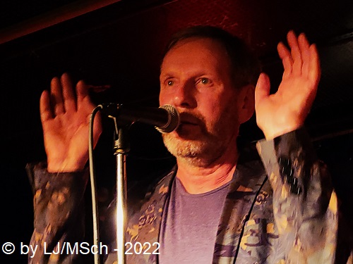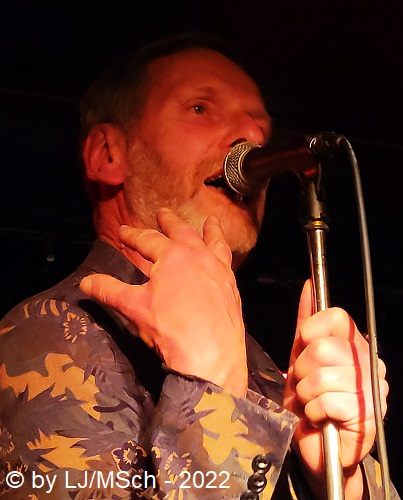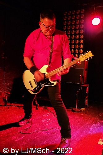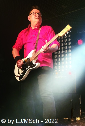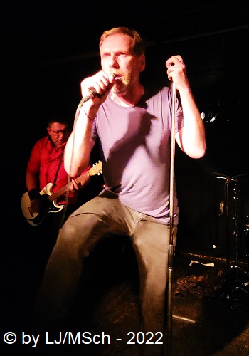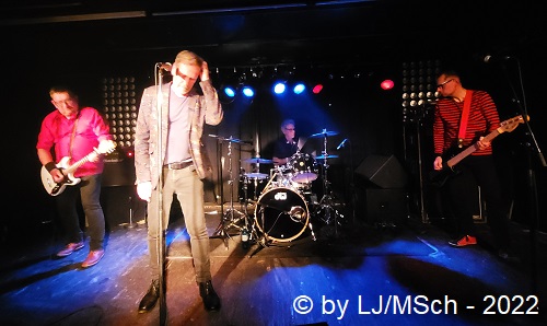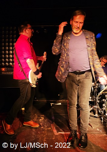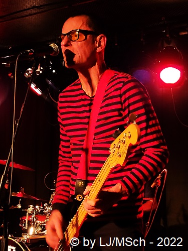 Dementsprechend früher gings dann um 20:45 Uhr mit dem Hauptact los und auch gleich ins Eingemachte. Das „Disco-Lied“ von ihrer ersten EP Umsturz im Kinderzimmer und „Der Unbekannte“ von 80 Tage auf See, beides aus dem Jahr 1980. Nach ein paar Minuten taute das Publikum auf und es wurde gejubelt. Mattus, etwas statisch hinterm Mikro, wie seinerzeit in den alten Videos zu sehen, sprechgesangelte wie in alten Zeiten. „Nicht warten“ kam jetzt an die Reihe, und nicht warten wollten einige Gäste und verlangten nach bekannten Songs der Band. „Gurus und Geheimagenten“, „Frau Krause“ oder den „Baggersee“, welcher 1981 nur auf einer Single B-Seite zu finden war. Die A-Seite jener Single stand jetzt auf dem Programm – „Sandmann“. Das Publikum interagierte sehr schön mit der Band und diese zeigte sich begeistert. Mattus erzählte freudig, dass sich sogar zwei Münchner auf den weiten Weg zu ihnen gemacht hatten. EKT grinste in einem durch und feuerte seine Riffs durch den Club, Lars hinter seinen Kesseln zeigte sich zufrieden und lediglich Jens Gallmeyer an den vier Saiten behielt seinen stoischen, fast mürrischen Gesichtsausdruck das ganze Set über bei. Ein Dreierblock vom zweiten Album Unmodern wurde jetzt dargeboten. „Laut“, „Das Tier“ und „Blaue Matrosen“, in dem „La Paloma“ sehr gekonnt verwurschtelt wird. Der Mix aus Deutschpunk, Minimal und New Wave, seinerzeit als Neue Deutsche Welle klassifiziert, kam sichtlich gut an bei den Leuten und es wurde getanzt. Nach „Mitternacht“ vom Debutalbum folge die Ansage, dass die folgende Nummer jetzt speziell für „den Manni“ sei, und es kam die Riesenschlange aus dem Dschungel gekrochen – die „Anakonda“, nach welcher mittlerweile auch schon aus dem Hintergrund verlangt wurde. Die erste Strophe brachte Mattus auch noch gut rüber, aber dann verpasste er seinen Einsatz und in der Schlange bildete sich ein regelrechter Knoten. Also Abbruch und erneut angesetzt. Dieses Mal klappte es und so kam ich immerhin in den Genuss, die „Anakonda“ eineinhalb mal hören zu können. Auch nicht schlecht. Das Publikum nahm den kleinen Fauxpas locker auf und durfte sich bei den letzten fünf Songs des regulären Sets auf einen Block vom ersten Album freuen. „Licht und Dunkelheit“, „Dauerlauf“, „13“, „Telefonlied“ und mit „Gib mir den Tod“ beendeten Der Moderne Man das reguläre Programm. Großes Gejohle und Gepfeife und die andauernden Zugabe-Rufe ließen die Band nur kurz backstage verschnaufen. Schon nach ein paar Minuten kamen die Musiker zurück auf die Bühne und zeigten sich begeistert, wie gut sie bei den Leuten noch ankamen. Der Moderne Man wurde richtig gefeiert, und endlich kam sie zum Zug. „Frau Krause“ vom letzten Album Neues aus Hong Kong – und was machte „Frau Krause“ anschließend? Sie ging natürlich an den „Baggersee“. Alles jubelte und mit „Vergesslichkeit“ fand auch der Zugabenblock sein Ende und die Musiker durften in die Garderobe. Tja … dem Publikum war das aber noch nicht genug und nach vielen lauten Zugabe-Rufen mussten sie doch wieder zurück auf die Stage. Freudig lachend und den Kopf schüttelnd anlässlich der Begeisterung meinten sie, dass sie einen Song wiederholen müssten, weil der Rest grad nicht abrufbar war. Leider kamen keine Gurus und auch keine Geheimagenten vorbei, sondern lauter „Blaue Matrosen“ fielen von der Reling, was natürlich nach 40 Jahren auf See irgendwie verständlich war. War aber auch egal, denn abgefeiert wurde trotzdem.