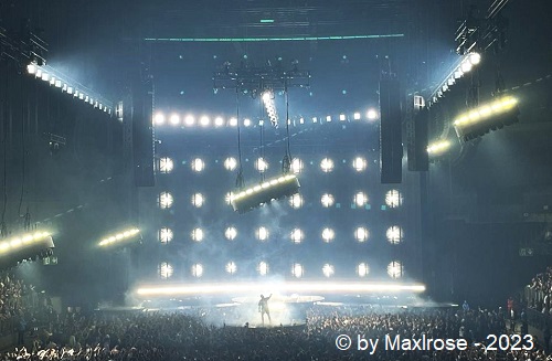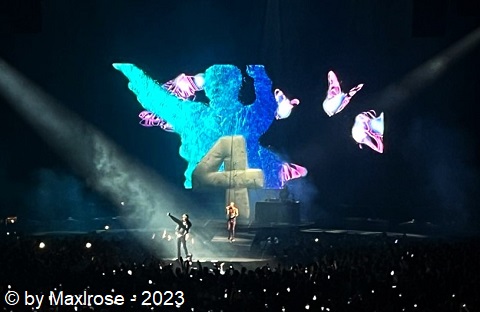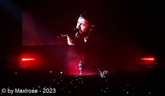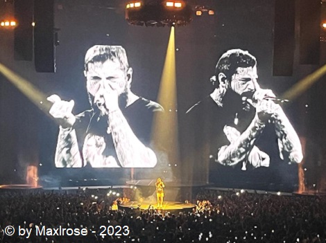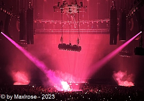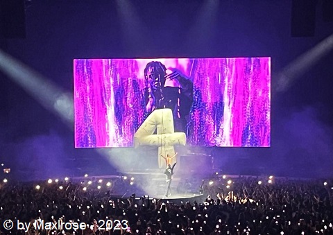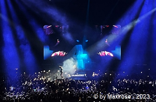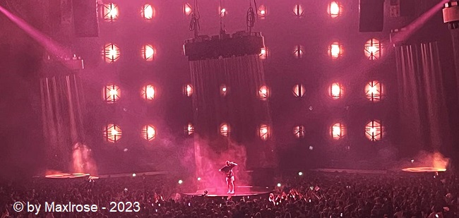 Aber the best is yet to come. Um genau 21:15 Uhr kommt unter Strobo Licht im Dirk Nowitzki Shirt Austin Richard Post auf die Bühne der Lanxess Arena und beginnt die Show mit dem ersten Song seiner letzten Platte Reputation. Die ausverkaufte Halle steht direkt Kopf. Post ist unfassbar sympathisch und besticht durch seine Fannähe. Im Laufe des Konzertes hat er sich auf die Bühne gelegt und jedem in der ersten Reihe die Hand gegeben oder Buckethats aufgezogen, Fotos gemacht. So etwas macht Spaß zu sehen. Nach ein paar Tracks wendet er sich mit einem roten Doublecup in der Hand zur Menge, begrüßt diese gebührend und prostet einem zu. In seinen Ansprachen zeigt er Dankbarkeit für die Rezeption und ihm ist anzusehen, was er für einen wahnsinnigen Spaß auf der Bühne hat. Er entschuldigt sich im Vorhinein schon mehrfach für seine Stimmprobleme. „I hope I don’t fuck it up!“ Diese werden zum Teil deutlich und klingen bei einigen Tönen schmerzhaft, aber Post Malone scheint das wenig zu interessieren. Er gibt dennoch Vollgas. Passend zum Namen der Tour spielt er fast die Hälfte seiner 2022er Scheibe Twelve Karat Toothache. Mit acht Songs nimmt es circa ein Drittel der Setlist ein und gibt einen guten Mix zu Klassikern wie „I fall Apart“ und „Go Flex“ von Stoney, sowie den nachfolgenden Hitalben. Meine Favorit Beerbongs & Bentleys ist ebenfalls stark vertreten. Das Kölner Publikum ist durch die Bank weg sehr textsicher und lässt sich von Posts Energie mitnehmen. Es ist aber auch schwierig, nicht mitgerissen zu werden von dem Typen. Zudem sind Lichteffekte und Feuerwerk allererste Sahne. Das Ganze sieht nicht nur sehr gut aus, es klingt auch gut. Die Variabilität in den Stilrichtungen der Tracks machen für mich das Konzert besonders. Es ist zum Teil sehr poppig, dann wieder hoch emotional. Harter Trap wechselt sich ab mit Elementen des Metalcore, kurz wirkt es wieder wie in den 90ern – mit eingeklemmter Zigarette emotional „Stay“ auf der Akustikgitarre spielend, um danach diese brutalst zu zerschlagen. Den emotionalen Höhepunkt des Abends macht allerdings nicht Post Malone selber. Im Anschluss an den Riesenhit „Rockstar“ kommen auf einmal zwei Meter im Lederanzug ala Elvis auf die Bühne. Es wird extrem laut im Publikum. Der Ludwigshafener Rapper Apache 207 kommt auf die Bühne und performt „Fühlst du das auch“. Das einzige, was noch verrückter ist, als die Reaktion der Menge, sind Posts Dance Moves. Apropos Gastauftritte: Swae Lee von vorher kommt für „Sunflower“ nochmal auf die Bühne und abermals geht es richtig rund zu den fröhlichen Klängen des Songs. Nach ungefähr 100 Minuten Power wird Post nochmal emotional und bedankt sich recht herzlich für den unfassbaren Abend! Er raucht noch die letzte Zigarette. Man spürt, es geht zu Ende. Sehr schade – das hätte gerne noch weitergehen dürfen. Aber einen hat er noch. Den Abschluss macht der laut Post Malone „einzige gute Song, den er je geschrieben hat“, „White Iverson“ von seinem Debutalbum Stoney. Es singen und dancen nochmal alle richtig ab. Ein gebührender Abschluss für einen verrückten Abend!