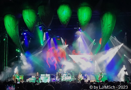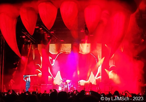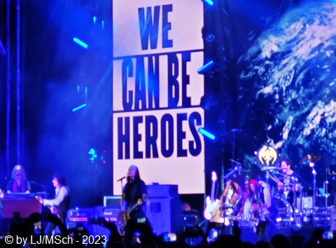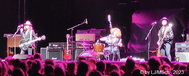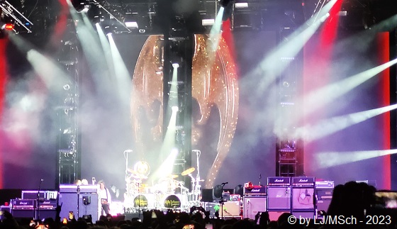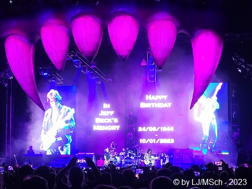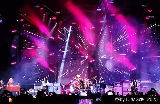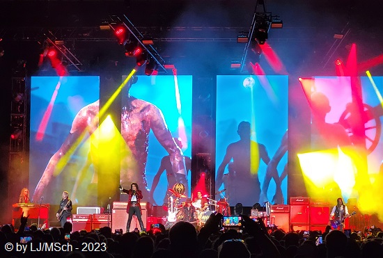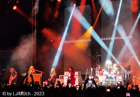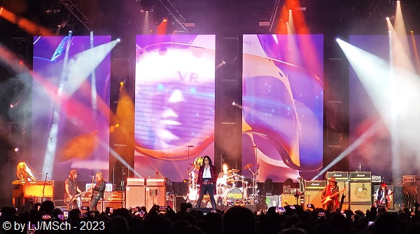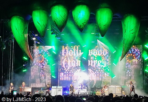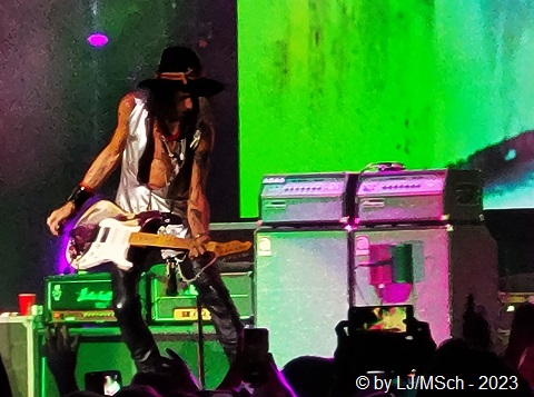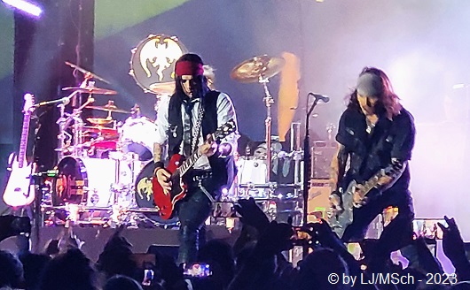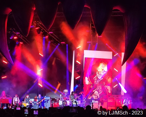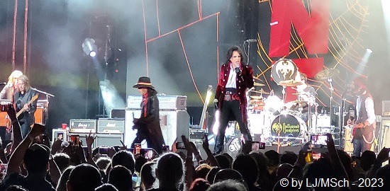Ebenfalls ein Cover, aber wieder mit Alice Cooper am Mikro stand jetzt „The Jack“ von den Young Brüdern aus Australien auf der Setlist. AC/DC kommt halt immer an, egal ob Original oder Coverversion. Nach dem Vampires-Original „As bad as I am“ vom Debut, kam dann ein Song, der schon von vielen Leuten erwartet wurde. Johnny am Mikro sang „Heroes“ von David Bowie. „We can be Heroes, just for one Day“ heißt es da im Text und der Held fast aller weiblichen Zuhörerinnen war in dem Moment der Mann am Mikro. Alice, mit umgeschnallter Gitarre, spielte in dem Moment nur die Nebenrolle. Als sich Gitarrist Joe Perry eine weiße Gitarre umschnallte, wurde Johnny Depp am Mikro sentimental. Hatte er doch mit seinem Spezl Jeff Beck im vorangegangenen Juli das Tollwoodzelt live beschallt, ist der ehemalige Yardbirds Gitarrist am 10. Januar dieses Jahres leider unerwartet von uns gegangen. Am heutigen 24. Juni hätte Jeff Beck seinen 79. Geburtstag gefeiert und die weiße Sechssaiter auf der Schulter von Perry war die Original-Stratocaster von Beck. Das folgende „Jeff Beck Tribute“ artete zu einer Gitarrenorgie aus, während auf den Leinwänden im Hintergrund viele alte Bilder von Jeff Beck zu sehen waren. Wir lassen das Augenmerk bei Joe Perry, denn nun kam ein Cover seiner alten Band Aerosmith aufs Tableau. „Bright Light Fright“ vom 1977er Album Draw the Line ist jetzt nicht allzu oft zu hören und auch bei vielen Aerosmith Fans nicht gerade erste Wahl. Mal ein besonderer Augenblick. Auf dem 18 Album von Depp und Beck befindet sich ein wahrer Kracher der Sparte Rock. „The Death and Resurrection Show“, im Original von Jaz Coleman und seinen Killing Joke, einer englischen Post-Punk Gruppe. Wieder ein Kracher, der alle zum Mittanzen brachte. Mit dem weltbekannten Drumintro und dem Riff auf Joe Perrys Gitarre leitete die Band einen Mega-Hit von Aerosmith ein. „Walk this Way“ kennt ja wirklich fast jeder Rockfan rund um den Globus. Alles tanzte und sang mit. Tiny Bradshaw ist jetzt nicht unbedingt ein Name, der vielen Musikfans geläufig ist. Bradshaw war ein Jazzdrummer, Pianist, Sänger und Bandleader, der von den 30er bis in die 50er Jahre aktiv war. Die wenigsten kennen ihn und sein Werk, wohl aber einen seiner Songs aus dem Jahr 1951. Nicht im Original, aber die Coverversion von Aerosmith auf ihrem zweiten Album Get your Wings von 1974 und einem ihrer größten Hits. Mit „The Train kept A-Rollin'“ endete das reguläre Programm der Hollywood Vampires und die Band wurde extrem abgefeiert. Die Minuten, in der die Musiker hinter der Bühne verschwunden waren, dauerten aber nicht allzu lang. Schon bald enterte Alice Cooper die Bühne zurück, in weißem Frack und Zylinder gewandet. Jeder wusste sofort, was jetzt kommen würde. Die wohlbekannten Klänge einer Schulglocke leiteten den Mega-Hit von Alice Cooper ein. „School’s out“ von 1971. Wie immer machte Meister Alice mit seinen Mannen ein kleines Medley aus dem Song. Flocht er doch immer wieder Parts von „Another Brick in the Wall“ von Pink Floyd in den Song ein. Das wars dann aber auch wirklich und nach knapp zwei Stunden fand ein guter Konzertabend sein Ende.