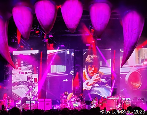 Als Sound in der Umbaupause wurde einiges vom gemeinsamen Album „18“ von Johnny Depp und Jeff Beck gespielt. Das passte gut zum Abend. Pünktlich um 21:00 Uhr wurde es dunkel und auf den Leinwänden im Bühnenhintergrund tauchten stilisierte Bilder von Depp, Cooper, Perry und Hendriksen auf, die im Stile eines Tattoos gemalt wurden. Dazu kam aus den Boxen „Bela Lugosi’s Dead“ von Bauhaus.