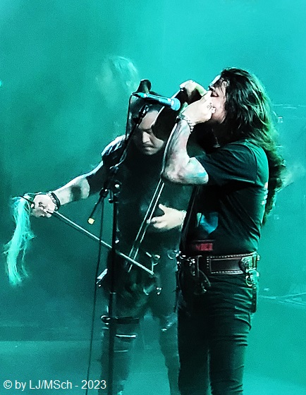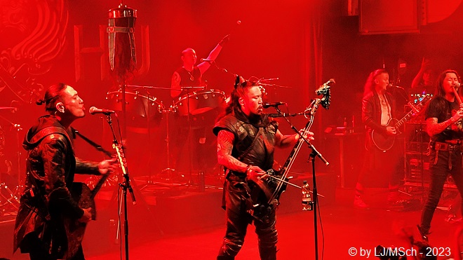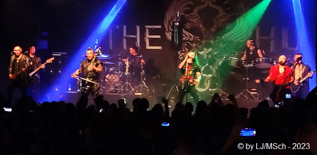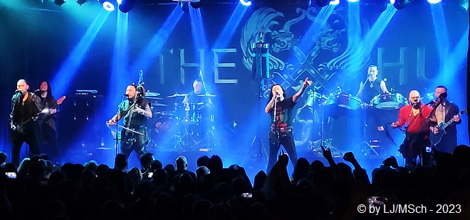 Es wurde dunkel und die ersten archaischen Töne erklangen. Vom ersten Ton an jubelte das komplette Publikum begeistert und chantete laut „Hu … Hu … Hu … Hu … Hu“, was sich fast wie ein Schlachtgesang anhörte. Die Stimmung war bombastisch. In der Livebesetzung stehen bei The HU satte acht Mann auf der Bühne. Sänger Jaya, der nebenbei noch die mongolische Flöte Tsuur und die Maultrommel Heel Khuur spielt, Gala und Enkush spielen beide die Horin Khuur, die traditionelle Pferdekopfgeige und singen, an der Torshuur, der mongolischen Laute, war Temka zu sehen. Dieses Quartett wurde komplettiert von zwei Schlagzeugern/Percussionisten, sowie einem Gitarristen und einem Bassisten.