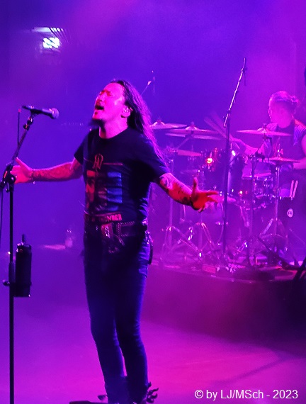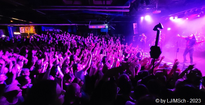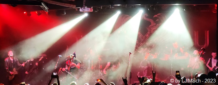 Eine kurze Sache will ich noch zum Schluss anbringen. Das Backstage-Werk ist jetzt nicht unbedingt eine kleine Location, schließlich passen ja an die 2.500 Leute bei Konzerten hinein. Ein (männlicher) Fan von The HU bot mir freundlicherweise und freiwillig zeitweilig seinen Platz auf einer Podesttreppe im hintersten Bereich des Backstags-Werks an, um besser ein paar Bilder mit dem Handy machen zu können. Ich wollte ja für diesen Bericht eine optische Ergänzung zum Text liefern. Danke nochmals für dafür! Insgesamt stand ich vielleicht zehn Minuten auf dieser Treppenstufe, zusammengerechnet auf die Konzertlänge. Regt sich eine (weibliche) „Konzertbesucherin“, die schräg neben/hinter mir stand doch tatsächlich auf, ich solle das Knipsen doch bleiben lassen, weil man das Ganze je sowieso bald auf YouTube sehen könnte. Falls die Göre das hier lesen sollte – Fräuleinchen … hast du dir bei deiner sensationellen Argumentation mal drei Gedanken gemacht, warum du erstens, eigentlich hier im Konzert stehst? Du könntest das Ganze doch eh ein paar Tage später problemlos auf YouTube anschauen … zweitens, wie die Bilder und Videos eigentlich auf YouTube kommen (nicht durch uns!) … und drittens, warum du nicht einfach weiterhin an mir vorbeisiehst, denn ich stand nicht mal direkt vor Dir und habe Deine Sicht nicht verdeckt, oder weiter vor gehst. Wäre ja genug Platz im Werk….. Der Platz war wohlgemerkt am hinteren Rand der Halle.