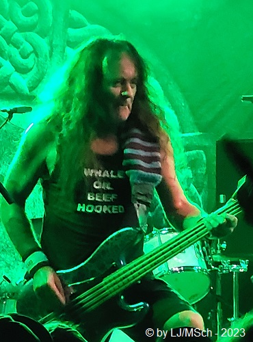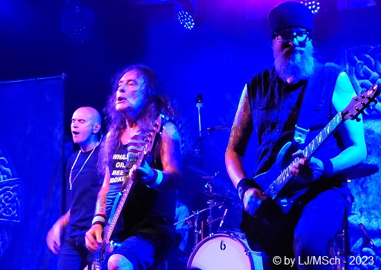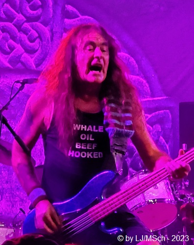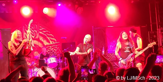 Sänger Richard Taylor stand charismatisch im Mittelpunkt und wusste stimmlich sehr zu überzeugen. Die beiden Axemänner David Hawkins und Grahame Leslie flankierten Taylor und wurden massiv abgefeiert. Im Hintergrund an der Schießbude verrichtete Simon Dawson solide seinen Dienst. Steve Harris wirbelte mit seinem Bass wie ein tanzender Derwisch kreuz und quer über die Bühne. Man sah ihm an, dass er die komplette Nähe zu seinen Fans genoss und regelrecht aufsaugte. Steve Harris ist ja beileibe nicht mehr der Jüngste und er hat sich als Begleiter altgediente Haudegen ausgesucht. So spielten Leslie und Dawson bereits in den 80ern zusammen bei The Outfield (You remember: „Your Love“). Da ich The Outfield seinerzeit live gesehen habe, müsste ich die beiden damals schon live on Stage erlebt haben. Die Fans in der Halle veranstalteten ein riesen Spektakel und feierten die Band. Jetzt könnte man vermuten, dass es größenteils Maiden-Fans waren, die Harris aus der Nähe sehen wollten. Aber nix da – alle Musiker wurden bejubelt, vor allem David Hawkins. Es war eine geile Stimmung zwischen Band und Publikum. Da passte kein Blatt dazwischen. Zwischendurch griff Richard Taylor immer wieder mal zur akustischen Gitarre. Bei der Bandvorstellung wurde vor allem Simon Dawson frenetisch bejubelt, feierte der doch an diesem Abend seinen 40. Hochzeitstag. Steve kam aus dem Grinsen gar nicht mehr heraus, man sah ihm den Mega-Spaß richtig an.