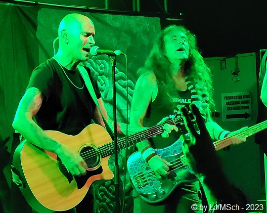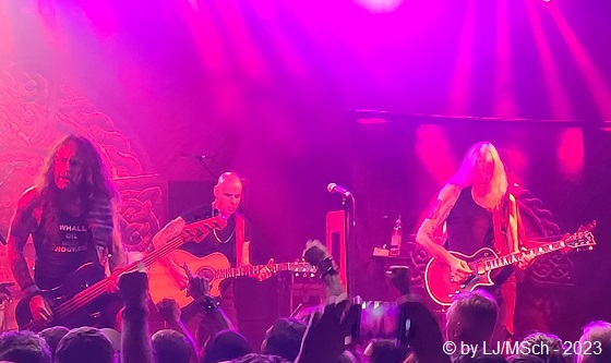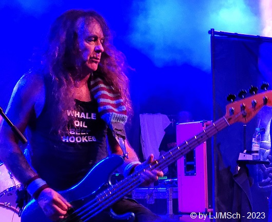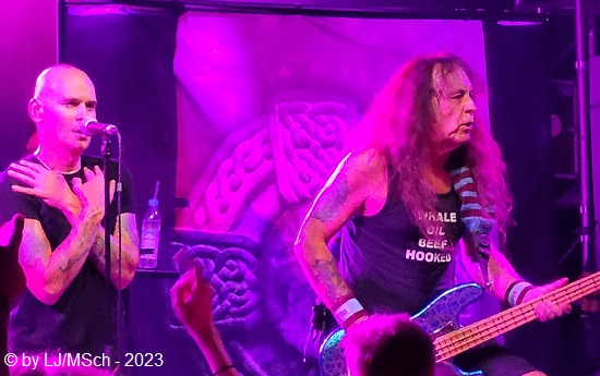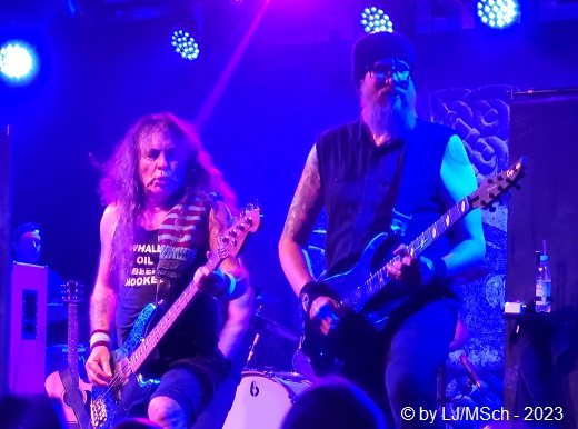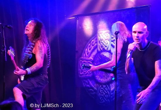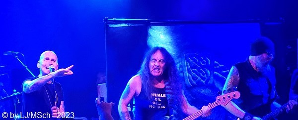 Sänger Richard Taylor stand charismatisch im Mittelpunkt und wusste stimmlich sehr zu überzeugen. Die beiden Axemänner David Hawkins und Grahame Leslie flankierten Taylor und wurden massiv abgefeiert. Im Hintergrund an der Schießbude verrichtete Simon Dawson solide seinen Dienst. Steve Harris wirbelte mit seinem Bass wie ein tanzender Derwisch kreuz und quer über die Bühne. Man sah ihm an, dass er die komplette Nähe zu seinen Fans genoss und regelrecht aufsaugte. Steve Harris ist ja beileibe nicht mehr der Jüngste und er hat sich als Begleiter altgediente Haudegen ausgesucht. So spielten Leslie und Dawson bereits in den 80ern zusammen bei The Outfield (You remember: „Your Love“). Da ich The Outfield seinerzeit live gesehen habe, müsste ich die beiden damals schon live on Stage erlebt haben. Die Fans in der Halle veranstalteten ein riesen Spektakel und feierten die Band. Jetzt könnte man vermuten, dass es größenteils Maiden-Fans waren, die Harris aus der Nähe sehen wollten. Aber nix da – alle Musiker wurden bejubelt, vor allem David Hawkins. Es war eine geile Stimmung zwischen Band und Publikum. Da passte kein Blatt dazwischen. Zwischendurch griff Richard Taylor immer wieder mal zur akustischen Gitarre. Bei der Bandvorstellung wurde vor allem Simon Dawson frenetisch bejubelt, feierte der doch an diesem Abend seinen 40. Hochzeitstag. Steve kam aus dem Grinsen gar nicht mehr heraus, man sah ihm den Mega-Spaß richtig an.