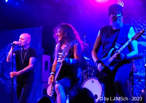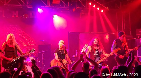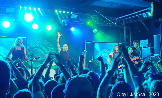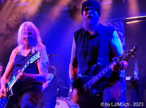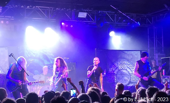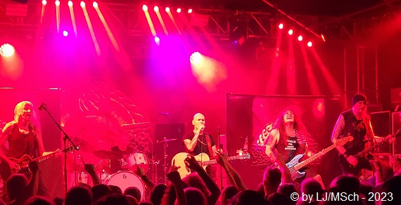 Als wir im Backstage ankamen, war die Vorgruppe bereits am Spielen. Darktribe hießen die, kamen aus Frankreich und spielten Power-Metal. Die Franzosen haben mich persönlich jetzt nicht gerade vollends umgehauen, aber die relativ volle Halle applaudierte kräftig und nicht nur der Höflichkeit halber. Metalfans sind halt doch eine eingeschworene Gemeinschaft. Hab aber auch schon schlechtere Bands spielen sehen, die Jungs beherrschten ihr Metier.