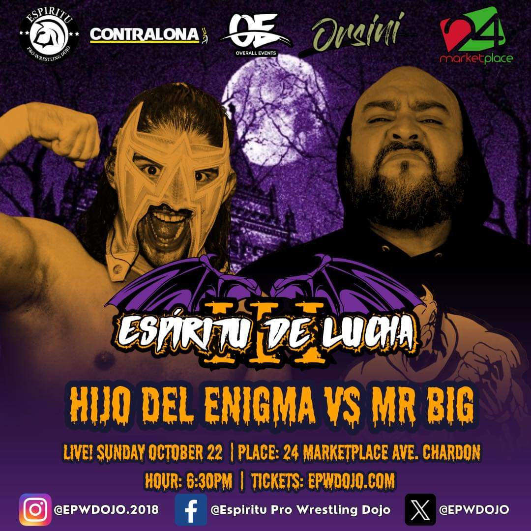 Ein Dog Collar Match soll es sein, als wäre es nicht schon eine Herausforderung, Hijo del Enigma gegen Mr. Big zu sehen. Ein bisschen ungleich scheint dieser Kampf zu sein, erschwert durch die Kette, die mit Halsbändern an den beiden Kontrahenten befestigt wird. Es scheint klar zu sein, wer gewinnt – leichtes Spiel für Mr. Big. Vielleicht gibt es ja Hilfe, Chris Mendoza wird seinen Schützling heute wohl eher alleine lassen, aber vielleicht schlägt sich ja jemand auf die Seite von Enigma. Der zeigt keine Angst, wird aber bald zum Spielball seines Gegners. Da hilft auch die beste Technik nichts, Mr. Big ist erheblich größer und hat mehr Masse. Ein kurzer Zug an der Kette und Enigmas Pläne sind zunichte gemacht. Er muss auch Schläge mit der Kette einstecken. Kurzzeitig reitet er auf dem Größeren, bevor dieser ihn abwirft. Das Ende, muss ich zugeben, habe ich erst nicht verstanden. Ziel war es aber, dass man alle vier Ringecken berühren muss, um zu gewinnen. Mr. Big will dies tun mit Enigma auf den Schultern und übersieht dabei, dass Enigma ebenfalls drei Ringecken berührt, bevor er seinen Gegner davon abbringt, auf die vierte zu schlagen. Nach kurzem Gerangel kann Enigma auf den noch fehlenden Pfosten schlagen und gewinnt somit. Mr. Big ist damit nicht einverstanden, schlägt erst mit der Kette auf den Referee ein, geht dann auf Hijo del Enigma los und macht klar, was er vom Ergebnis des Kampfes hält. Schließlich klaut er dessen Maske und setzt sie auf. Aber es kommt zu keiner Enthüllung, mit einer Jacke über dem Kopf verlässt schließlich auch der angeschlagene Sieger den Ring.