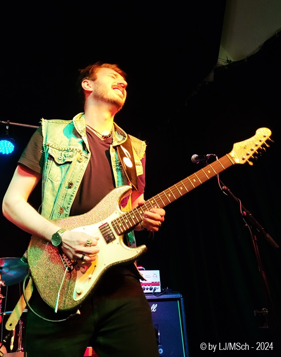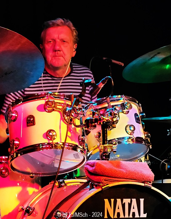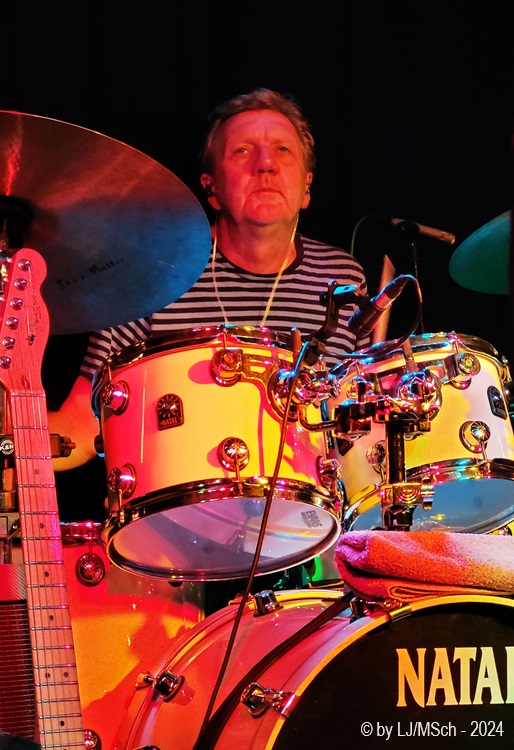 An den Drums, etwas versteckt, sitzt Eddie Filip. Für mich ein komplett neues Gesicht, aber was soll man sagen? Wer bei den Blues Brothers aus Hamburg auf der Bühne steht, hat sich seine Sporen verdient und weiß, wie er mit seinem Instrument umzugehen hat. Filip, der auch schon für Inga Rumpf, Hannes Wader oder Alex Conti getroommelt hat, bearbeitet seine Felle und legt irgendwann ein klasse Solo hin, das auf jeder großen Bühne Platz hätte.