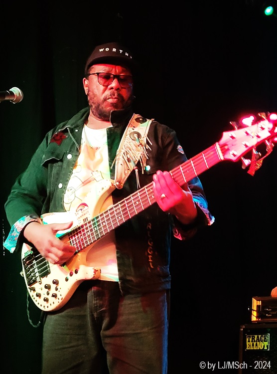 Auf der anderen Seite steht Reggie Worthy. Er bringt mit seiner Bassgitarre eine funkige Note ins Spiel und das gefällt. Zum einen, weil es etwas anderes ist und nicht das, was man vielleicht von einer Bluesband erwartet. Der Funk zieht mit und sorgt für ordentlich Stimmung. Als Reggie und Krissy zusammen in der Mitte der Bühne stehen und ihre Instrumente in einen feinen, fetziges Dialog bringen, ist niemand im Saal mehr zu halten. Lauter Jubel mischt sich mit rhythmischem Klatschen und heftigem Hüftschwung. Was bei einem Auftritt mit ihm natürlich auch nicht fehlen darf: „Nutbush City Limits“, der erfolgreiche Hit von Tina Turner, stand Worthy doch mit ihr jahrelang gemeinsam auf der Bühne.