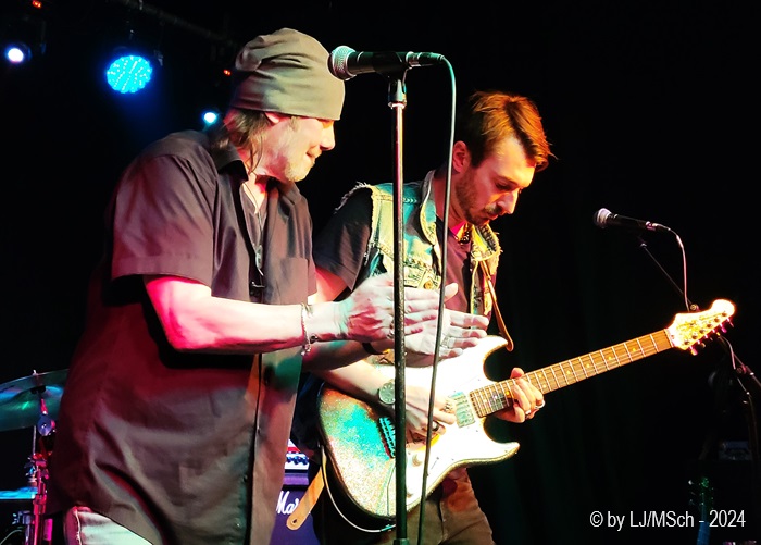 Wie immer ertönt „Auf der Reeperbahn nachts um halb eins“ aus den Lautsprechern, das Publikum schunkelt und singt mit und das Quartett betritt die Bühne. Es ist anders an diesem Abend, aber nicht langweilig. Eine gute Mischung aus rockigem Blues und auch ruhigeren Tönen schallt einem vorerst etwas zurückhaltendem Publikum entgegen. Das taut aber bald auf, schwingt die Hüften, klatscht im Takt und jubelt der HBB zu. Gert Lange wechselt zwischen den Gitarren und dem Mikrophon hin und her, heizt die Zuschauer an, lässt Raum für seine Kollegen. Ein bisschen Humor darf dabei auch nicht fehlen und mit einem Augenzwinkern wird auf das fortschreitende Alter aufmerksam gemacht. Er singt aus voller Kehle und sein Alter merkt man ihm dabei nicht an. Neben ihm steht das junge Supertalent am Sechssaiter, Krissy Matthews. Steht er auf der Bühne, wird er eins mit der Gitarre und entlockt ihr mit graziöser Fingerarbeit unvorstellbaren Sound. Langsam und sanft genauso wie schnell und kraftvoll. Aber auch sein Gesang zieht in den Bann. Und mit einem Augenzwinkern spricht er irgendwann sogar vom „Garching am Arsch der Welt“ und nennt sich selbst den „am besten Hochdeutschsprechenden der Welt“. Tatsächlich hat der Brite in den vergangenen Jahren nicht zuletzt durch das Touren mit der HBB ordentlich Deutsch gelernt. Etwas stiller und melancholisch wird es, als er seinen Song „Hairdryin‘ Drummer Man“ präsentiert. Dieser ist dem verstorbenen Hansi Wallbaum gewidmet und für einen Moment schließt man die Augen und erinnert sich an den weißhaarigen Drummer Man, fester Bestandteil der HBB bis zu seinem Tod und schmerzlich vermisst.