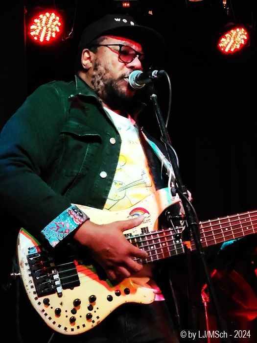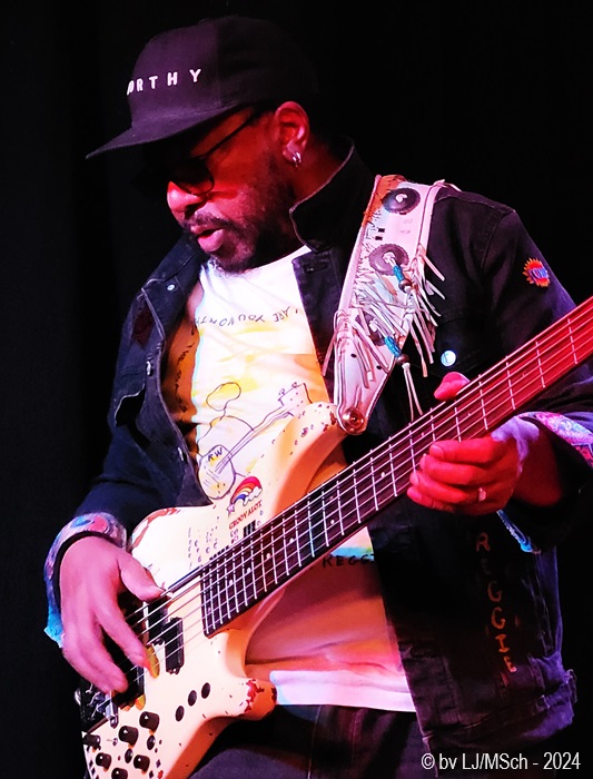 Auf der anderen Seite steht Reggie Worthy. Er bringt mit seiner Bassgitarre eine funkige Note ins Spiel und das gefällt. Zum einen, weil es etwas anderes ist und nicht das, was man vielleicht von einer Bluesband erwartet. Der Funk zieht mit und sorgt für ordentlich Stimmung. Als Reggie und Krissy zusammen in der Mitte der Bühne stehen und ihre Instrumente in einen feinen, fetziges Dialog bringen, ist niemand im Saal mehr zu halten. Lauter Jubel mischt sich mit rhythmischem Klatschen und heftigem Hüftschwung. Was bei einem Auftritt mit ihm natürlich auch nicht fehlen darf: „Nutbush City Limits“, der erfolgreiche Hit von Tina Turner, stand Worthy doch mit ihr jahrelang gemeinsam auf der Bühne.