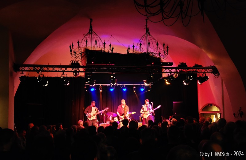 Wie immer ertönt „Auf der Reeperbahn nachts um halb eins“ aus den Lautsprechern, das Publikum schunkelt und singt mit und das Quartett betritt die Bühne. Es ist anders an diesem Abend, aber nicht langweilig. Eine gute Mischung aus rockigem Blues und auch ruhigeren Tönen schallt einem vorerst etwas zurückhaltendem Publikum entgegen. Das taut aber bald auf, schwingt die Hüften, klatscht im Takt und jubelt der HBB zu. Gert Lange wechselt zwischen den Gitarren und dem Mikrophon hin und her, heizt die Zuschauer an, lässt Raum für seine Kollegen. Ein bisschen Humor darf dabei auch nicht fehlen und mit einem Augenzwinkern wird auf das fortschreitende Alter aufmerksam gemacht. Er singt aus voller Kehle und sein Alter merkt man ihm dabei nicht an. Neben ihm steht das junge Supertalent am Sechssaiter, Krissy Matthews. Steht er auf der Bühne, wird er eins mit der Gitarre und entlockt ihr mit graziöser Fingerarbeit unvorstellbaren Sound. Langsam und sanft genauso wie schnell und kraftvoll. Aber auch sein Gesang zieht in den Bann. Und mit einem Augenzwinkern spricht er irgendwann sogar vom „Garching am Arsch der Welt“ und nennt sich selbst den „am besten Hochdeutschsprechenden der Welt“. Tatsächlich hat der Brite in den vergangenen Jahren nicht zuletzt durch das Touren mit der HBB ordentlich Deutsch gelernt. Etwas stiller und melancholisch wird es, als er seinen Song „Hairdryin‘ Drummer Man“ präsentiert. Dieser ist dem verstorbenen Hansi Wallbaum gewidmet und für einen Moment schließt man die Augen und erinnert sich an den weißhaarigen Drummer Man, fester Bestandteil der HBB bis zu seinem Tod und schmerzlich vermisst.