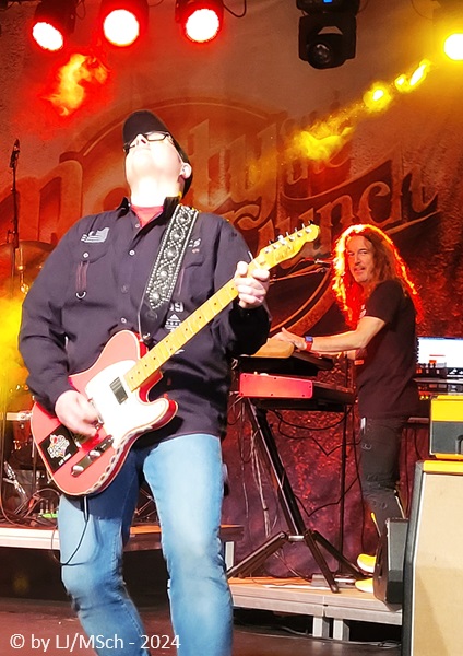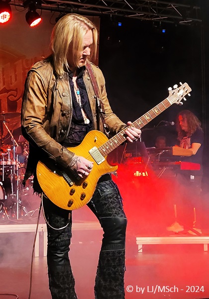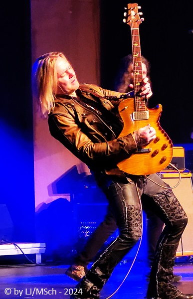 Nach dieser musikalischen Düsternis und einer kurzen Umbaupause war es dann endlich soweit. Das Saallicht erlosch und Gott hatte ein Einsehen und es wurde endlich Licht. Er schied das Licht von der Finsternis zuvor und Marty und seine Mitstreiter enterten die Bühne. Im Hintergrund nahm Carsten Enghardt, ein langjähriger Freund von Marty hinter seiner Schießbude Platz. Enghardt, der bereits für musikalische Größen wie Billy Preston oder Lionel Ritchie getrommelt hat, sorgte den ganzen Abend für einen druckvollen satten Punch und im Verbund mit einem Elektro-Gandalf an den vier dicken Saiten sorgte Carsten für ein solides Fundament, auf den sich der Rest der Band austoben konnten. Unser Gandalf heißt eigentlich Ian Edwards und stammt aus dem Vereinigtem Königreich. Umgeschnallt hatte er einen Gibson Thunderbird und wo ein Donnervogel losgelassen, wackeln die Fundamente. Hinter den Keyboards stand Michele Luppi, der dem einen oder anderen bekannt vorkam. Was auch kein Wunder wäre, denn sonst steht Luppi bei der englischen Rocklegende Whitesnake an der Seite vom Ex-Deep Purple Sänger David Coverdale auf den Brettern der diversen Konzertbühnen weltweit. Den Leadgitarristen konnte gar nichts aus der Ruhe bringen. Mit der Selbstverständlichkeit eines Rockstars zeigte er dem Gitarrennachwuchs der Vorgruppe, was Sache ist. Frank Pané ist große Bühnen gewohnt, steht er doch bereits seit zehn Jahren mit den Rockern von Bonfire auf der Bühne. Marty, sichtlich nervös stand rechts vom Sänger, der jetzt auf die Bühne kam. Dan Byrne ist eine kleinere Erscheinung, aber er strahlte sofort Sympathie ins Publikum aus. Was Byrne an Körpergröße fehlt, gleicht er mit Stimmgewalt aus. Welch eine grandiose Stimme aus diesem Körper kam, war kaum zu glauben. Von kräftig laut bis zart und leise, Byrne ist ein Riese an den Vocals.