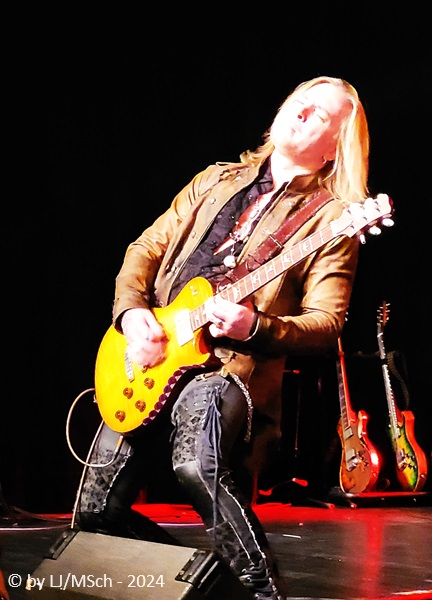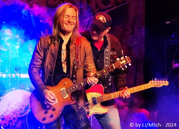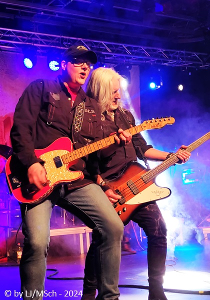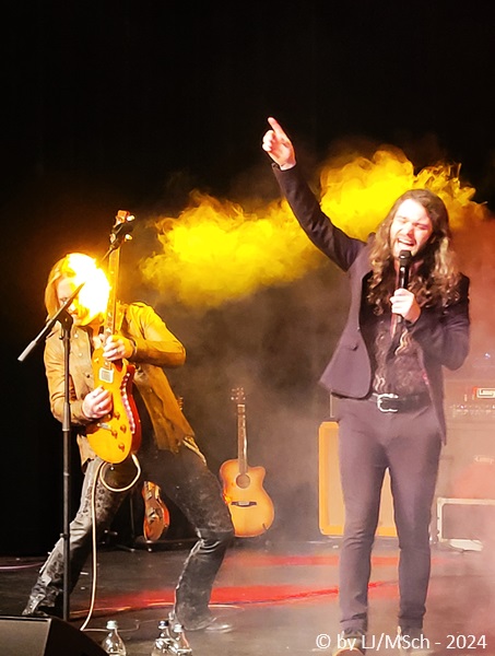 Von den ersten Tönen an überzeugten Marty und seine Mitstreiter auf ganzer Linie. Den Songtitel „The Time is now“ nahm Marty wörtlich. Hier und heute war der Zeitpunkt, um diese super Formation auf die Welt loszulassen. Marty beschränkte sich in seiner Rolle als Rhythmusgitarrist und ließ Pané in der Rolle des Gitarrenheros glänzen. Marty reiht sich mit seiner Zurücknahme in eine Reihe mit legendären Gitarrenhelden ein, die ebenfalls „nur“ Rhythmus spielen. John Lennon und Keith Richards sind jetzt nicht unbedingt die schlechtesten Vorbilder. Mit „Keep pushin‘ on“ feuerte die Band auch gleich die aktuelle Single des kommenden Albums auf die Gäste ab. Pané und Luppi merkte man ihren Status als erfahrene Musiker deutlich an. Nichts konnte sie erschüttern und sie schüttelten ihren Part locker aus dem Ärmel. Von Anfang an begleitete frenetischer Applaus den Auftritt. Jetzt möchte man fast meinen, dass Marty und seine Mitmusiker bereits jahrelang zusammenspielen. Aber weit gefehlt! Die erste gemeinsame Probe war nur drei (!) Tage zuvor erfolgt. Da stellt sich raus, wer was kann und wer nicht. Tja, hier konnten heute alle, und das auf das Allerbeste. Für einen Gänsehautmoment sorgte Dan Byrne, als er allein mit seiner Akustikgitarre seinen Song „Hemispheres“ zum Besten gab. Das komplette Set des Abends bestand fast ausschließlich aus Titeln vom kommenden Album. Lediglich „Walk a straight Line“ und „Demons“ stammten aus dem 2019er Album Walk a Straight Line. Zwischen den beiden älteren Songs durften Luppi und Pané solo zeigen, was sie auf dem Kasten haben. Nach dem rockigen „Don’t bother me“ durfte auch Carsten Enghardt sein Können einzeln vorführen. Tja … der Mann ist halt eine solide Bank. Ebenso auch Ian Edwards. Mit stoischer unerschütterlicher Ruhe bereitete er mit seinem Donnergrollen an den dicken Saiten die solide Basis. Nach der Powerballade „Deadwood“ kamen mit „Have Faith“ auch mal leisere Töne aus den Boxen. „Have Faith“ möchte man Marty laut zurufen … Glaub an dich … denn egal, ob Rock-Kracher oder Ballade – das Publikum im Kupferhaus bejubelte alles. Auch der eine oder andere Musiker von Alex Bender stand mittlerweile mitfeiernd im Publikum. Jetzt stand der eigentlich letzte Song der Show auf der Setlist. Wenn man wie Luppi sonst neben einer der größten Rockstimmen auf der Bühne steht, durfte natürlich ein Song nicht fehlen, den er sonst neben dem großen David Coverdale mit Whitesnake live performt, der aber bereits 1974 mit Deep Purple zu einem der größten Hits aus der Kehle von Coverdale wurde. Mit „Burn“ feuerten Marty and The Bad Punch eine Rockhymne der Extraklasse ins Kupferhaus ab. Die Stimmung konnte kaum besser sein. Ein sichtlich gerührter Marty konnte den nicht endenden Jubel kaum glauben. Nach ein paar Minuten ließen sich die Musiker wieder auf die Bühne zurück locken und sie feuerten ihre aktuelle Single „Keep pushin‘ on“ erneut auf die Menge ab.