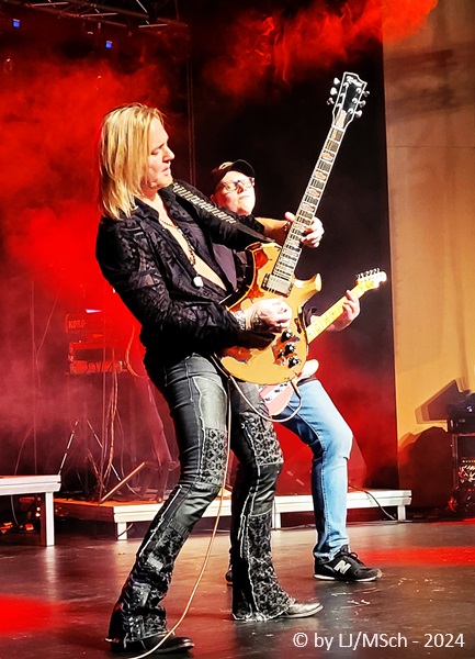 Los gings um kurz nach Acht mit einer Ansage vom Schirmherr der Veranstaltung, dem Planegger Lokalmatadoren Herman Rarebell, ehemaliger Schlagzeuger der Hardrocklegenden Scorpions. Als Vorgruppe sagt er den lokalen Sänger Alex Bender samt seiner Band an. Rock mit deutschen Texten stand auf dem Programm. Anscheinend brachte Bender seine komplette Bekanntschaft als Groupies mit, sah man doch einige mit T-Shirts rumlaufen mit Alex Bender Aufdruck. Es ging los und sofort machte sich bei mir Unbehagen breit. Bereits beim ersten Song kam mir das Ganze wie ein Auftritt einer Schülerband im Probenkeller einer beliebigen Schule vor. Bandchef Fabian Nafziger stand mit seiner Gretsch mittig und schmetterte seine deutschen Texte etwas übermotiviert ins Mikro. Eine unsägliche und komplett überflüssige Backgroundsängerin hampelte und hüpfte ebenso übermotiviert kreuz und quer über die Bühne, als ob sie der Star wäre. Ihr Gesang ließ dementsprechend auch ziemlich zu wünschen übrig. Ein sehr engagierter Kameramann lief andauernd kreuz und quer über die Bühne. Vom Keyboarder hörte man eigentlich nur seinen Nord-Synthie, den Roland so gut wie gar nicht, auch die Leadgitarre war so gut wie nicht zu hören. Wenigstens der Drummer verrichtete solide seinen Dienst. Irgendwann kam eine Saxofonistin mit auf die Bühne, optisch schon mal ansprechend in ihrer hautengen knappen Hose … die sich aber nicht einmal von vorn zeigte. Sie stand meistens mit dem Rücken oder schräg zum Publikum. Na ja, auch eine Art sich zu präsentieren. Irgendwann kam dann ein weiterer Gitarrist mit dazu, der aber auch nicht weiter auffiel. Mir reichte es schon bald und ich stand den Großteil vom Auftritt nebst vielen weiteren Gästen, die den Auftritt ebenfalls langweilig und öde fanden, draußen im Foyer. Beim Zugabenteil kamen dann Marty und Herman Rarebell mit auf die Bühne und es wurde das unvermeidliche „Rock you like a Hurricane“ der Scorps performt. Richtig auffallend an diesem Auftritt waren eigentlich nur zwei Faktoren. Die Gretsch vom Frontmann und der übereifrige Kameramann, diese beiden zeigten Präsenz. Sorry Jungs, aber das war rein gar nichts – weiter üben – ihr klingt wie eine x-beliebige Schülerband.
