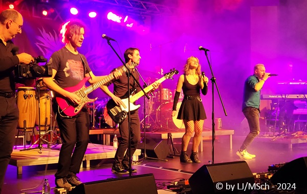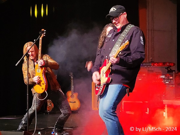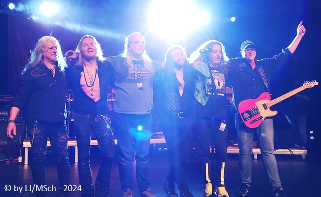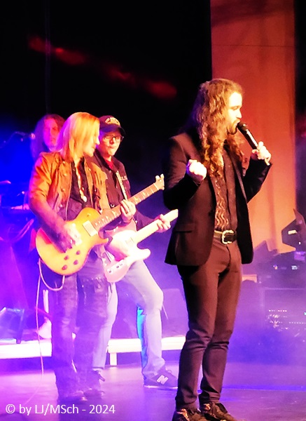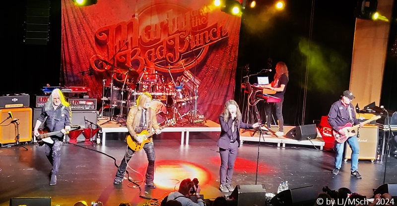 Los gings um kurz nach Acht mit einer Ansage vom Schirmherr der Veranstaltung, dem Planegger Lokalmatadoren Herman Rarebell, ehemaliger Schlagzeuger der Hardrocklegenden Scorpions. Als Vorgruppe sagt er den lokalen Sänger Alex Bender samt seiner Band an. Rock mit deutschen Texten stand auf dem Programm. Anscheinend brachte Bender seine komplette Bekanntschaft als Groupies mit, sah man doch einige mit T-Shirts rumlaufen mit Alex Bender Aufdruck. Es ging los und sofort machte sich bei mir Unbehagen breit. Bereits beim ersten Song kam mir das Ganze wie ein Auftritt einer Schülerband im Probenkeller einer beliebigen Schule vor. Bandchef Fabian Nafziger stand mit seiner Gretsch mittig und schmetterte seine deutschen Texte etwas übermotiviert ins Mikro. Eine unsägliche und komplett überflüssige Backgroundsängerin hampelte und hüpfte ebenso übermotiviert kreuz und quer über die Bühne, als ob sie der Star wäre. Ihr Gesang ließ dementsprechend auch ziemlich zu wünschen übrig. Ein sehr engagierter Kameramann lief andauernd kreuz und quer über die Bühne. Vom Keyboarder hörte man eigentlich nur seinen Nord-Synthie, den Roland so gut wie gar nicht, auch die Leadgitarre war so gut wie nicht zu hören. Wenigstens der Drummer verrichtete solide seinen Dienst. Irgendwann kam eine Saxofonistin mit auf die Bühne, optisch schon mal ansprechend in ihrer hautengen knappen Hose … die sich aber nicht einmal von vorn zeigte. Sie stand meistens mit dem Rücken oder schräg zum Publikum. Na ja, auch eine Art sich zu präsentieren. Irgendwann kam dann ein weiterer Gitarrist mit dazu, der aber auch nicht weiter auffiel. Mir reichte es schon bald und ich stand den Großteil vom Auftritt nebst vielen weiteren Gästen, die den Auftritt ebenfalls langweilig und öde fanden, draußen im Foyer. Beim Zugabenteil kamen dann Marty und Herman Rarebell mit auf die Bühne und es wurde das unvermeidliche „Rock you like a Hurricane“ der Scorps performt. Richtig auffallend an diesem Auftritt waren eigentlich nur zwei Faktoren. Die Gretsch vom Frontmann und der übereifrige Kameramann, diese beiden zeigten Präsenz. Sorry Jungs, aber das war rein gar nichts – weiter üben – ihr klingt wie eine x-beliebige Schülerband.